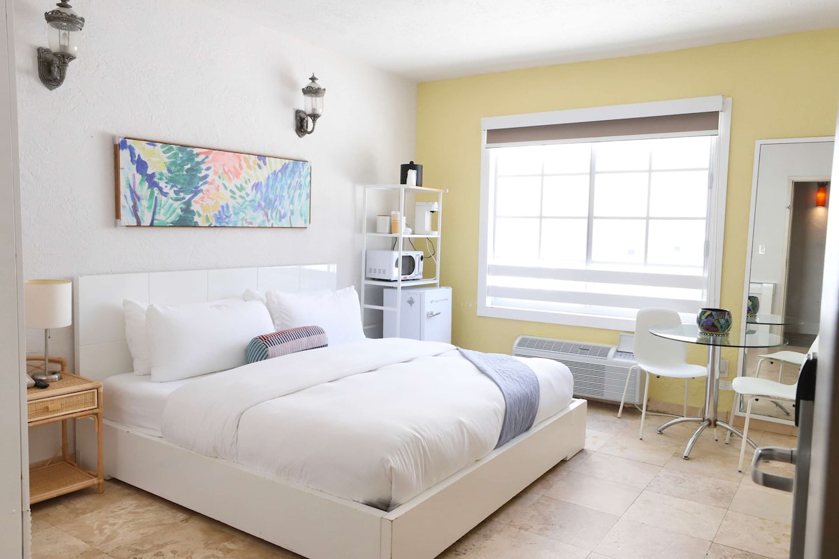 Stay in South of Fifth, Miami Beach’s most charming neighborhood just one block from the beach! This cozy unit features a king-size bed, Smart TV, Wi-Fi, AC, workspace, fridge, iron, hair dryer, & premium linens. Enjoy room service, coffee in the lobby, luggage dropoff, crib on request, & outdoor dining. Perfect for relaxing after a day in the sun. Walk to top restaurants, parks, & the ocean in minutes. On request parking is provided two blocks away from the hotel at a gated garage for $20/day.