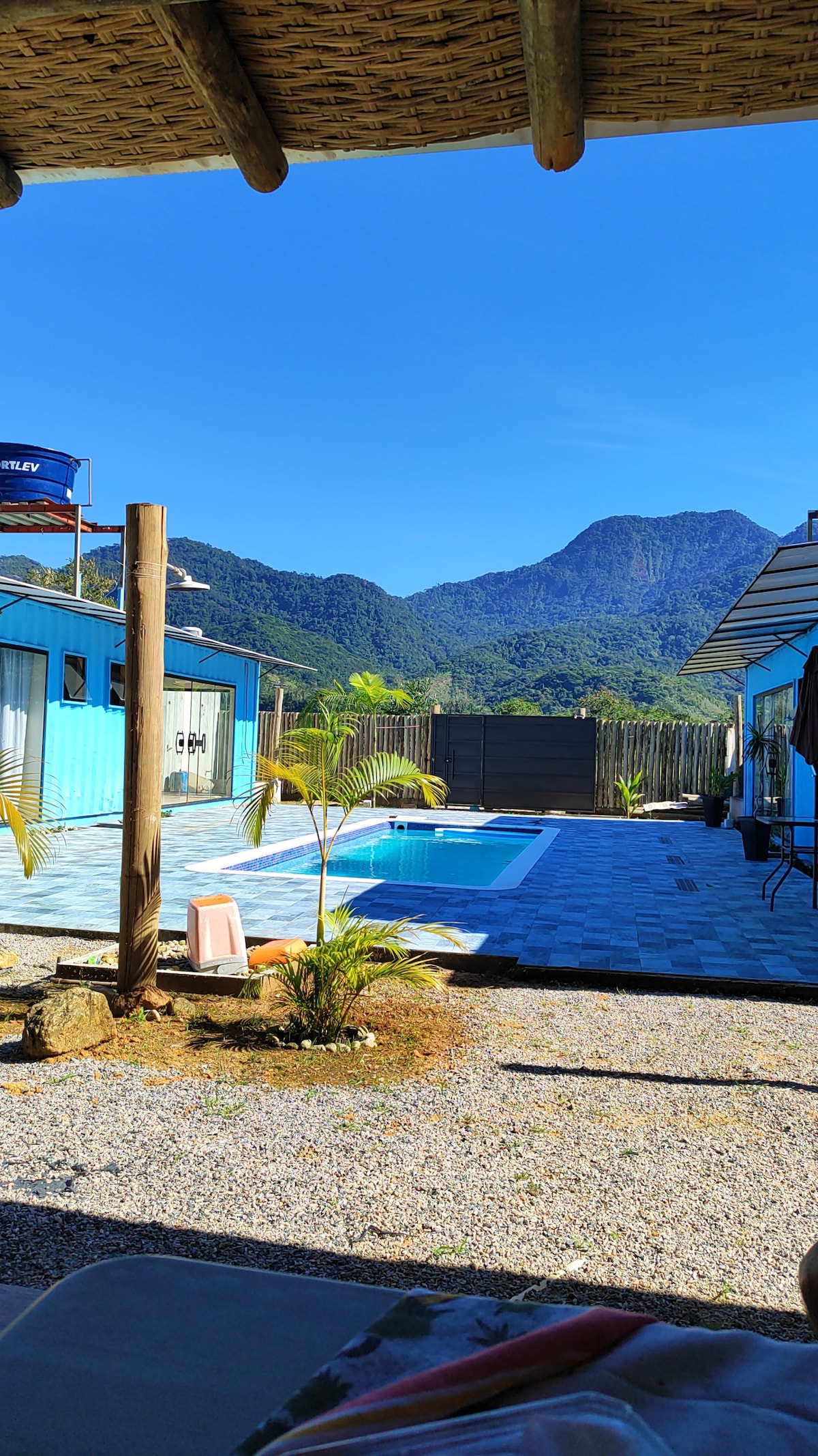 Þægileg og vel búin svíta fyrir par í sameiginlegri eign. Hér er hjónarúm, sjónvarp með Chromecast, vifta, loftkæling, skápur, rúm-/baðlín, strandstólar, kælir og sólhlíf. Það er með svalir með sveitalegu eldhúsi. Á lóðinni er sameiginleg sturta, þilfari, þvottahús, garður og Luau pláss. Við erum 800 m frá Lagoinha ströndinni og 300 m frá rústum og fossum. Veitingastaðir, ísbúðir og matvöruverslanir eru í nágrenninu.