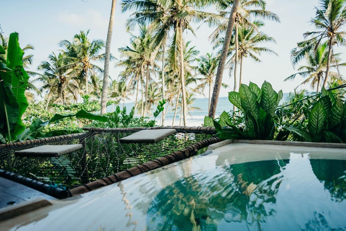 Ocean TreeHouse með sundlaug @SeeMore Beach TS2W @ SeeMore Beach - Jungle boutique Residence @ SeeMore Beach -Madiha Sri Lanka - Ocean Treehouse for 2 , Colonial Style Villa fyrir 6 , SeaView Designer Bungalow með einkasundlaug -for 4 - einkaströnd - Palmtree hangandi rúm - fjara setustofa - Bambus yfirgefa jóga Shalla - Residence er umkringt lítilli hæð og stórum suðrænum garði - staðsett í lok litla stígsins - alger rólegt