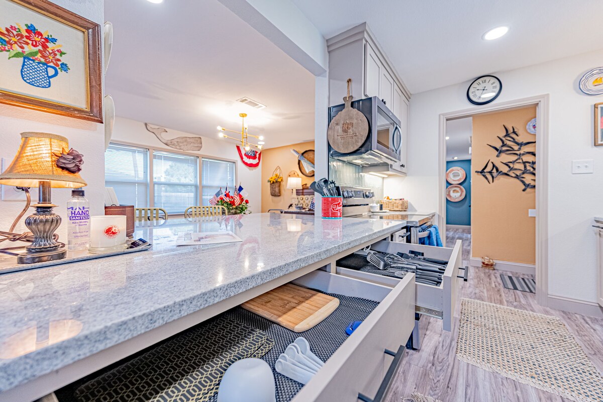 Íbúðin er að fullu uppfærð með öllum þægindum sem þú ert vön/vanur og meira til! Það er með eldhús með öllum þægindum á fimm stjörnu dvalarstað, þvottahús með nýrri þvottavél og þurrkara og afþreyingarsvæði með Roku (Hulu, NetFlix og Apple TV). Einingin inniheldur bestu Reverse Osmosis Systems drykkjarvatnssíukerfið getur keypt peninga. Við erum með háa endaskiptingu A/C einingu, þannig að þú verður ekki undirokaður við viðeigandi hitastig einhvers annars, eða lágt endareiningar dýra hótelsins.