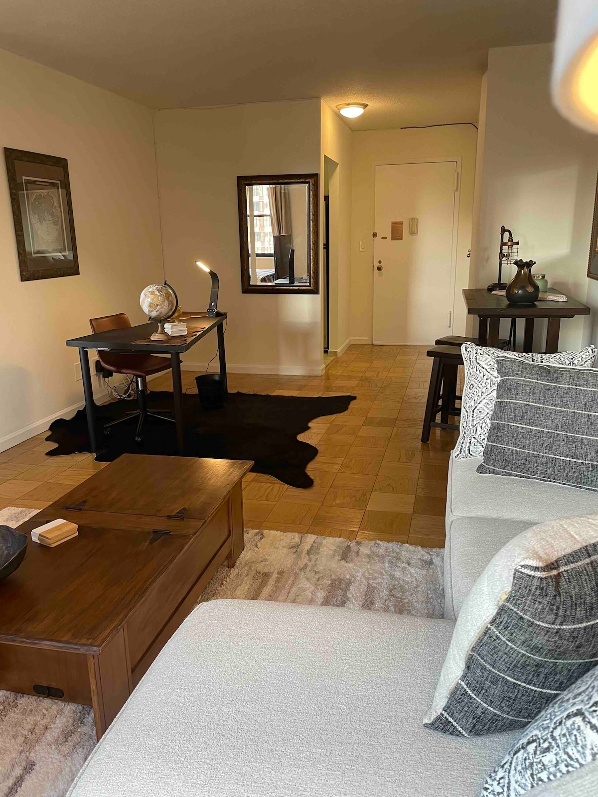 Verið velkomin á heimili þitt að heiman Studio with Office suite in the ideal Times Square location. Notalegar innréttingar, harðviðargólf og nútímaleg þægindi. Vel útbúið eldhús, mjúk rúmföt og sjónvarp. Fjarlægð frá mörgum vinsælum stöðum, veitingastöðum og verslunum. Bókaðu núna til að fá glæsilegt frí! Fullkomið frí fyrir minningardag og útskriftarhelgi!