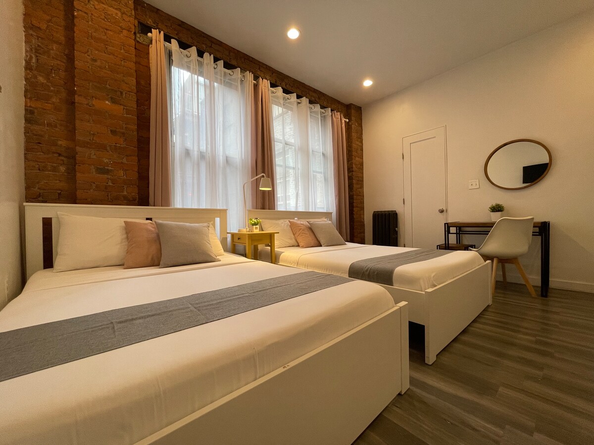 Upplifðu þægindin í rúmgóðri eins svefnherbergis íbúð sem rúmar allt að fimm gesti. Þessi tilvaldi staður er staðsettur nálægt Central Park, Times Square og Fifth Avenue og býður upp á þægindi og nálægð við suma af þekktustu stöðunum í New York. Fullkomið fyrir bæði stutta og lengri gistingu. Gakktu upp á aðra hæð. Ef þér finnst stigar vera óþægilegir getur verið að þetta henti þér ekki. (Ekki láta stigann koma í veg fyrir þig, það er vel þess virði fyrir þessa mögnuðu einingu í hjarta New York)!