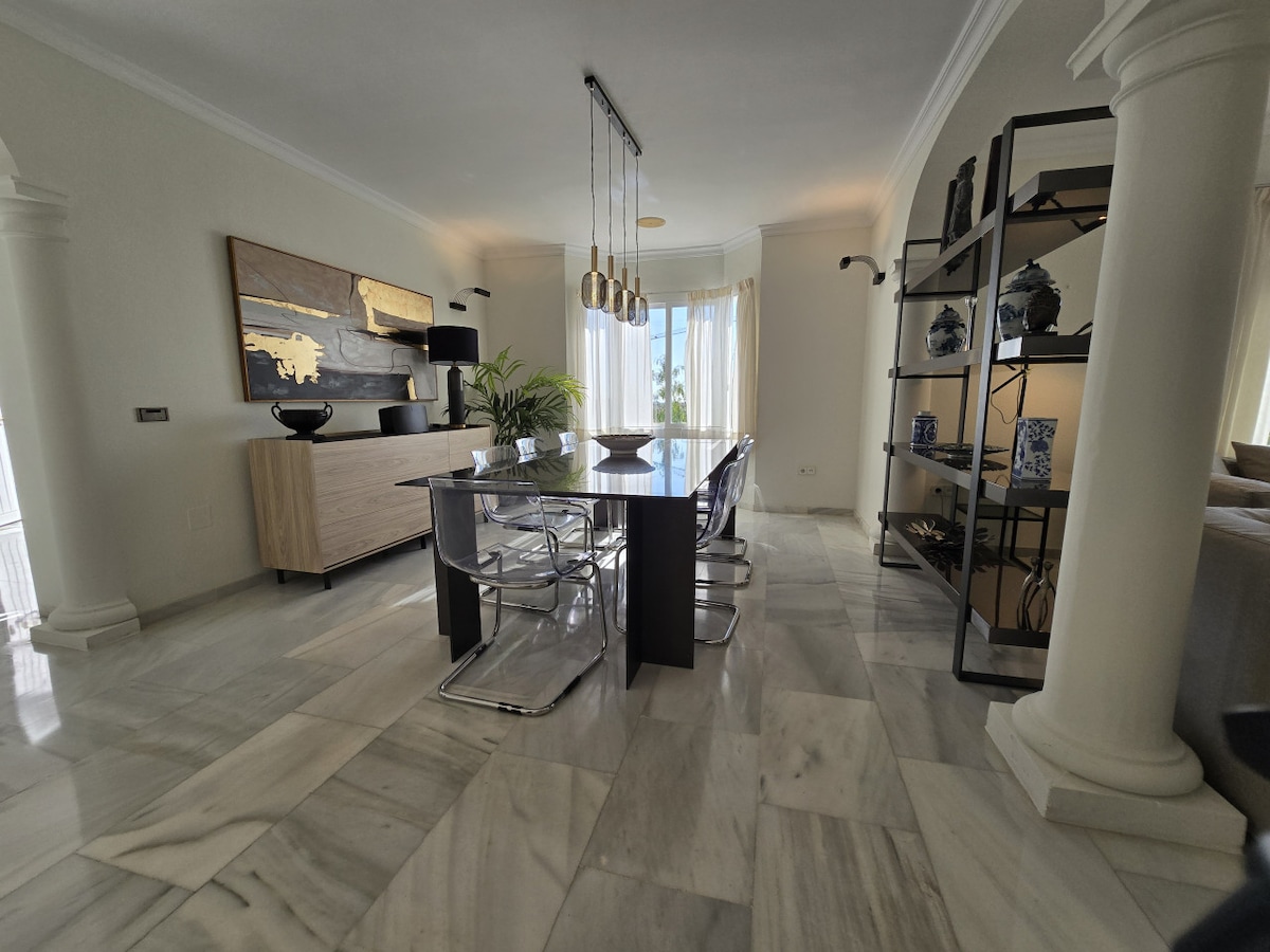 Njóttu konunglegra hátíða í þessari einstöku, nútímalegu villu með úrvalsþægindum og mögnuðu sjávarútsýni. Njóttu sólskins og sjávarútsýnis frá rúmgóðum veröndum sem snúa í suður. Það er staðsett í Cabopino, milli Marbella og Fuengirola og býður upp á greiðan aðgang að golfvöllum Costa del Sol, 700 metra frá ströndum, verslunum og næturlífi.