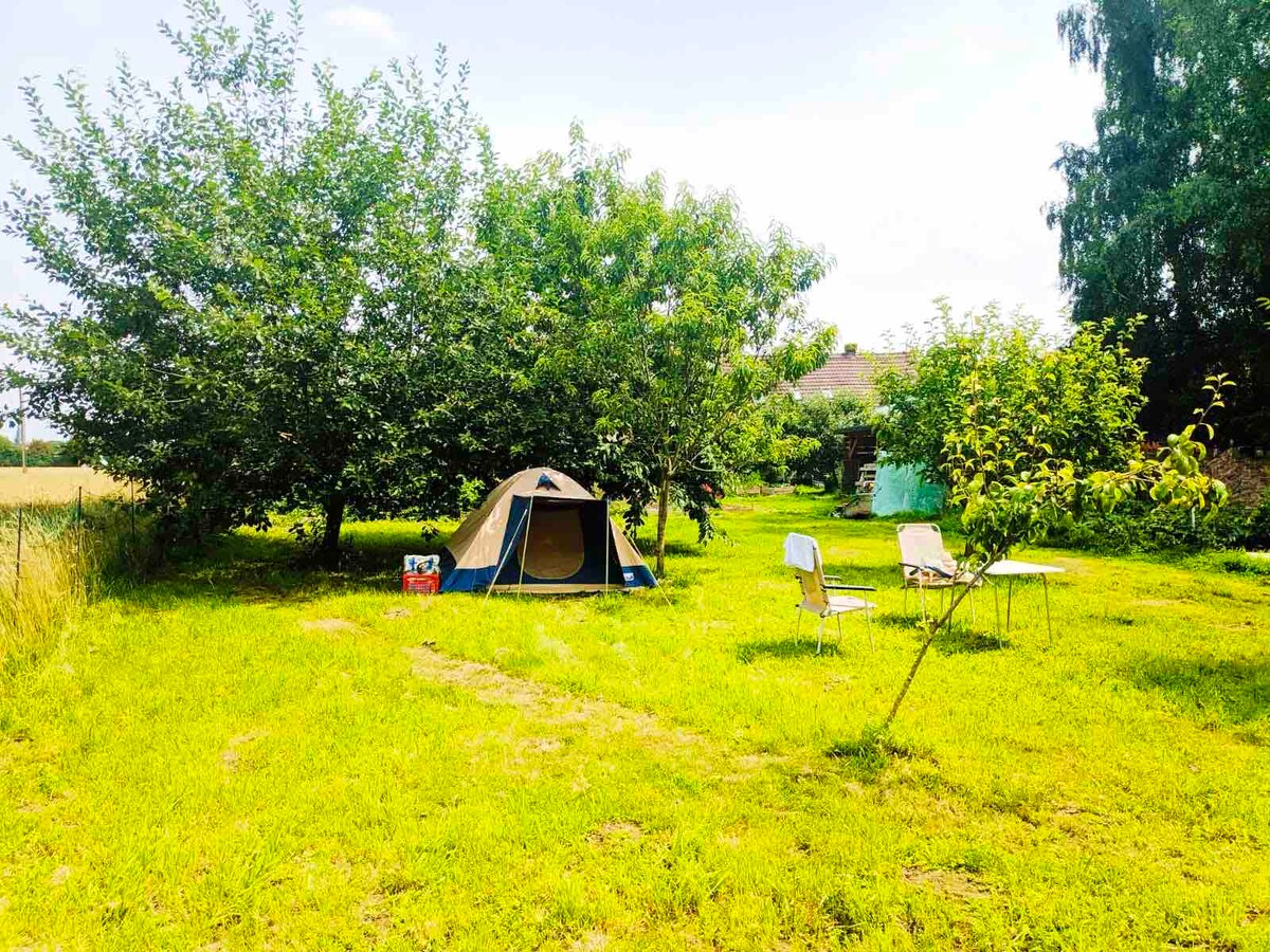 Útilega og útilega í miðri náttúrunni. Auk skógar- og friðlandsins er nóg að slökkva á þér í nokkra daga og nota þægindi húss við hliðina. Pláss fyrir tjöld, eigin hjólhýsi eða húsbíla og/ eða svefnaðstöðu okkar í húsbílnum og/ eða húsinu. Fyrir € 10,- aukalega er hægt að leigja 2 manna tjald "með".