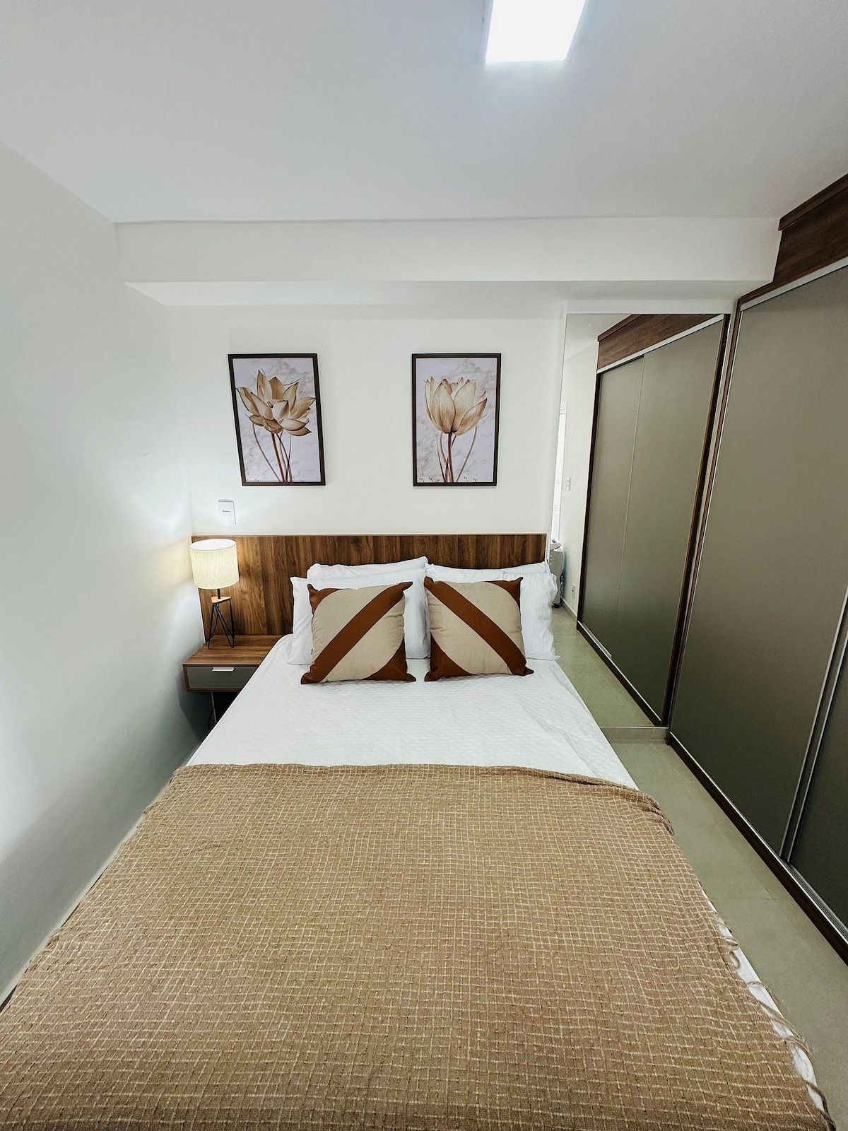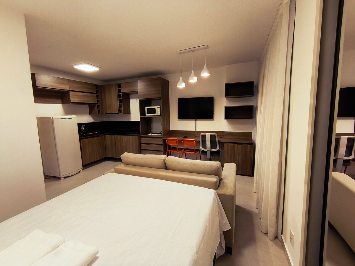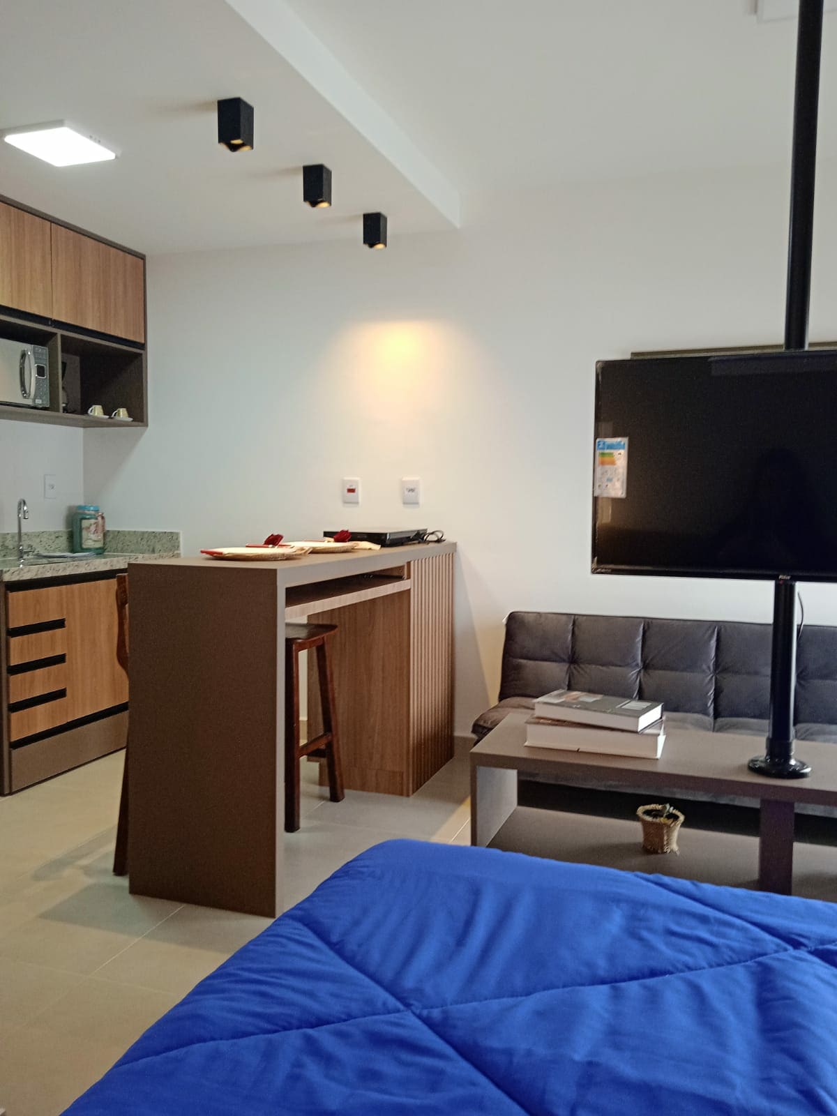 Apartamento super confortável tipo studio com localização imbatível para seus compromissos de trabalho e/ou lazer. ► Cama de casal com colchão de molas; ► Smart Tv 40” (incluso Netflix, Prime Video, Disney+ e Globoplay); ► Ar-condicionado; ► Ventilador turbo; ► Persiana tipo blackout; ► Roupeiro com cabides; ► Caixinha de som bluetooth; ► Mesa de estudos/trabalho com luminária; ► Sofá-cama para casal; ► Mesa para alimentação; ► Cozinha equipada para preparar pequenas refeições.