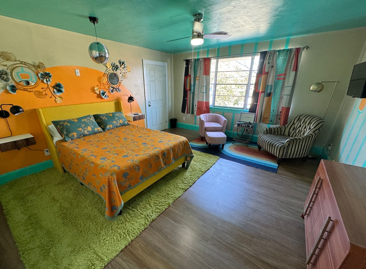 The Atomic Family room at the Hard Sell Hotel captures design elements from the 1940's all the way to the future. A subtle balance between a bomb shelter and the Jetsons. This no window room is perfect for people who enjoy their privacy and hate the sun. Hand built furniture and fixtures, soft shag rug, adjustable overhead lighting, bluetooth record player, mini fridge & smart TV are a perfect mix of that vintage feel and modern comfort.