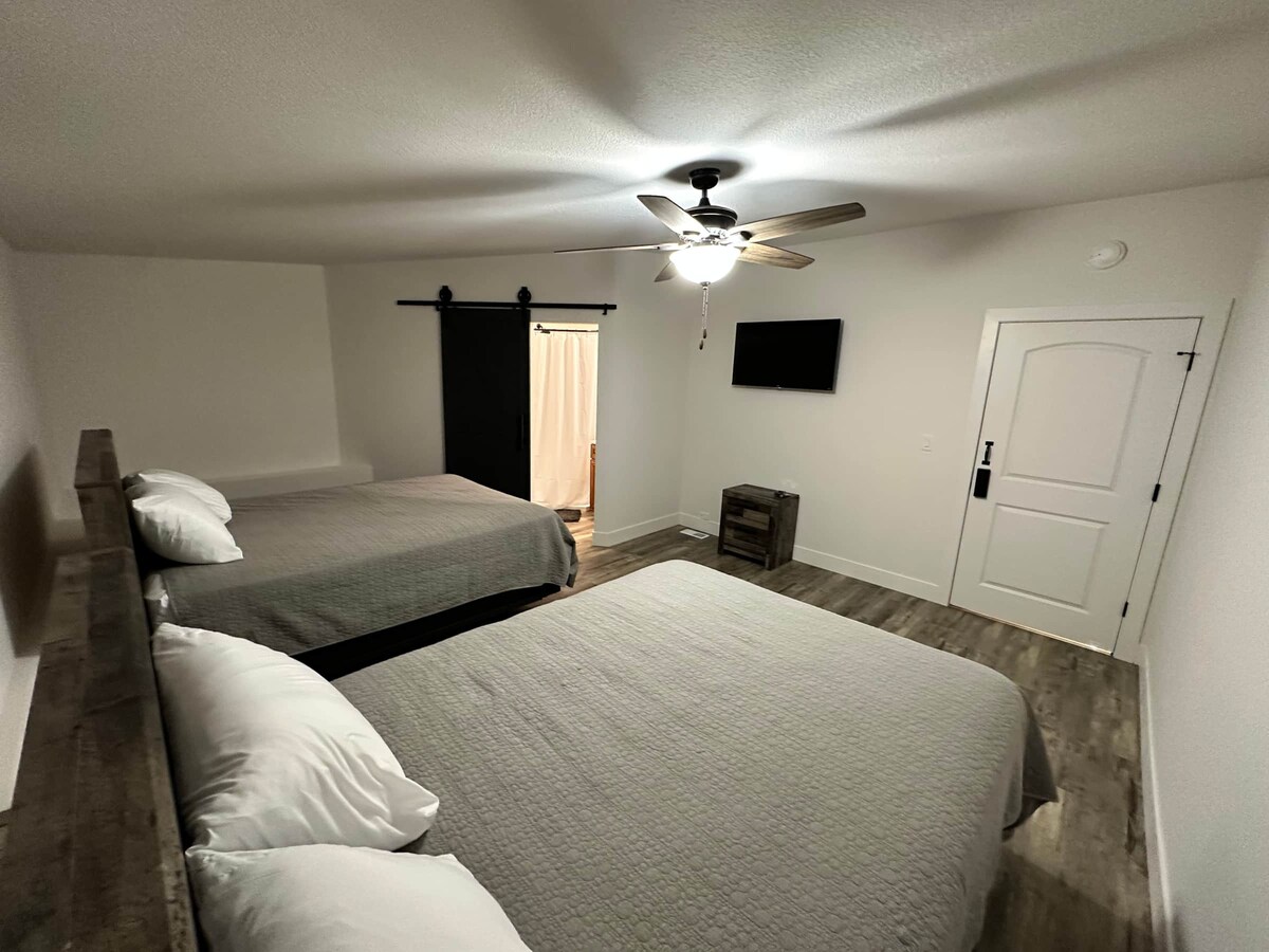 Our Keeper’s Quarters suite is on the main level of our Barndo. This suite offers 2 King bedrooms (with the option of a pullout couch upon request to sleep an additional 2), a full kitchen and dining area and living room area with a 58-in Smart TV already connected to free secure Wi-Fi. Your private bathroom features a large 4x6 shower and a single vanity setup. There is access directly to the main level back deck with your own spacious seating.