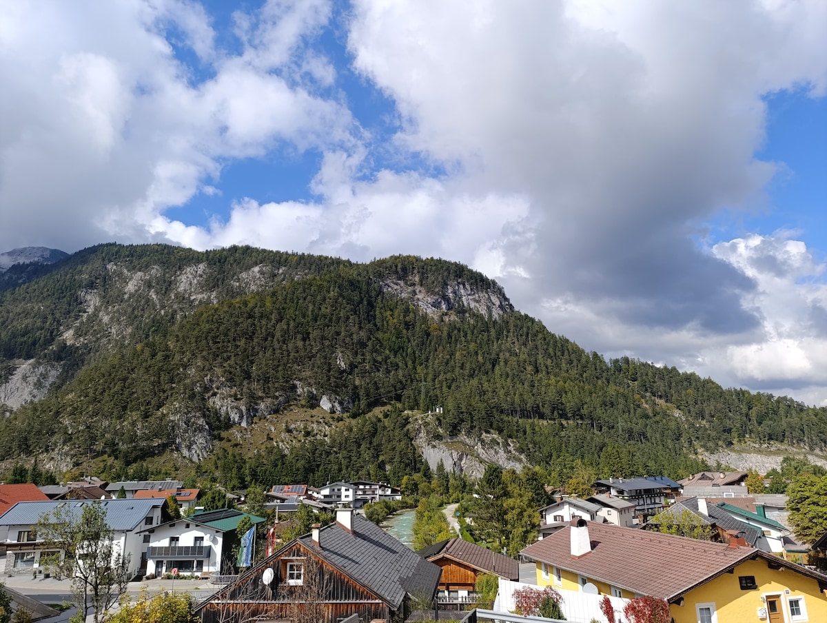 Íbúðin sem snýr í suður er með frábært útsýni yfir alpaheim Karwendel og Wetterstein. Það hefur nýlega verið endurnýjað og innréttað. Það eru svefnvalkostir fyrir allt að 4 manns - en það er tilvalið fyrir tvo til þrjá einstaklinga. Íbúðin er rétt undir 40 m2 af mjög hreinni stofu: borðstofa-stofa (með rúmgóðum, fullbúnum eldhúskrók), svefnherbergi (með breiðu hjónarúmi og nýjum dýnum), baðherbergi með dagsbirtu, svölum sem snúa í suður, einkabílastæði.