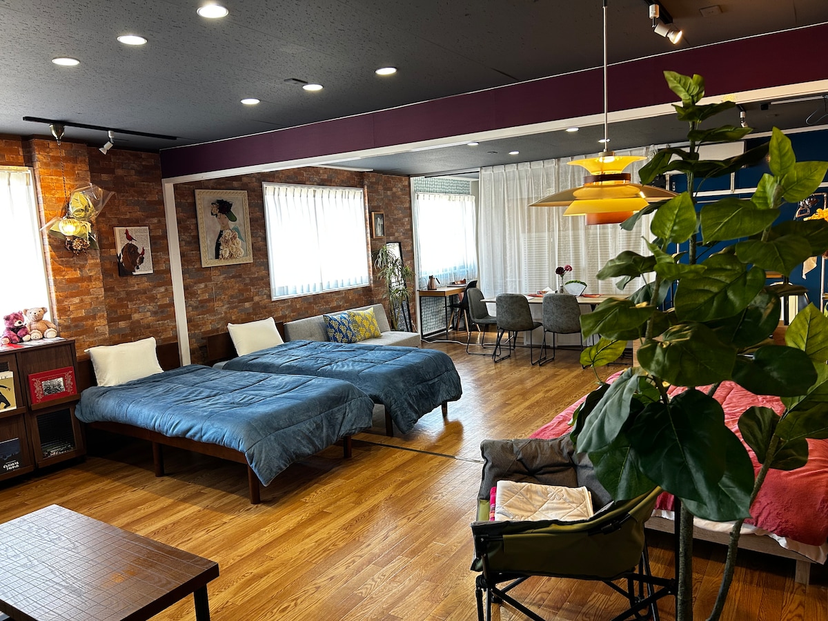 Þessi aðstaða er einkarekin gisting í útleigu á Miyazaki/Aoshima-svæðinu þar sem þú getur slakað á með fjölskyldunni og hundinum þínum. Eigandinn er einnig hengirúmsmiður og er með upprunaleg handprjónuð hengirúm í stofunni, svefnherberginu og viðarveröndinni. Njóttu sérstaks tíma í einkarými sem takmarkast við einn hóp á dag, umkringdur náttúrunni. ⸻ 📍Staðsetning og eiginleikar • 1 mínútu göngufjarlægð frá JR Kodomo-no-Kuni stöðinni á Aoshima-svæðinu í Miyazaki-héraði • Rólegt íbúðahverfi á móti „Kodomo no Kuni“ • 3 mínútna göngufjarlægð frá sjónum (einnig ráðlagt fyrir hundagöngu) • Gjaldfrjáls bílastæði í boði á staðnum • Kaffihús á staðnum (opið frá 11: 00 til 17: 00) • Hengirúm í boði (innan- og utandyra) • Á staðnum er hengirúmsverkstæði í garðinum (hundahlaup) en vinnustofan er lokuð meðan á dvölinni stendur • Rúmar allt að 6 manns/einkaleigu fyrir 1 hóp á dag ⸻