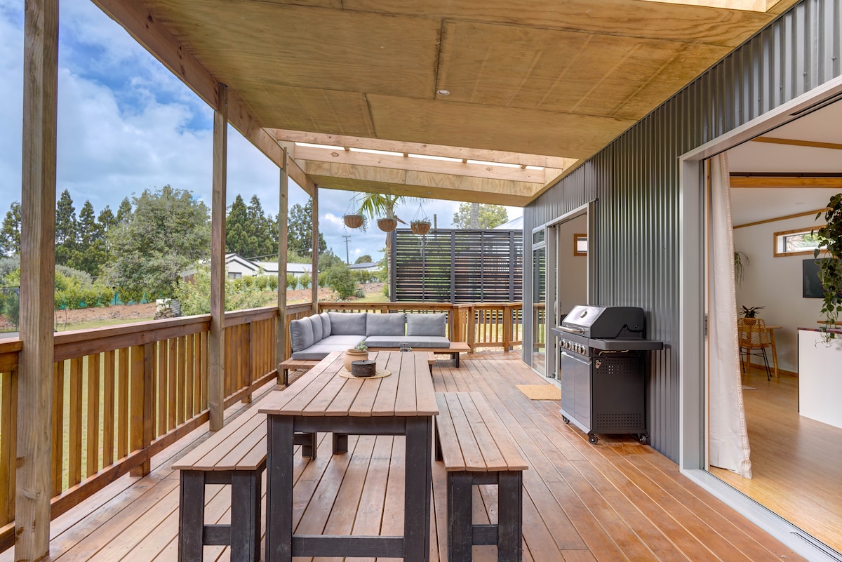 Your Air Conditioned accoms are a small Off Grid Tiny Home. It is situated in Taumārere just out of Kawakawa on SH11 on the way to Paihia on our working Regenerative Farm. Specifically built for couples to enjoy the privacy and beautiful farm views over green paddocks to the Cycleway and Vintage Railway. Our tiny house is intimate, open plan, with a small kitchen incl a double gas stovetop and a wee fridge/freezer. Check out our waterhole, walk with the cows, relax and enjoy! Paihia 17min drive