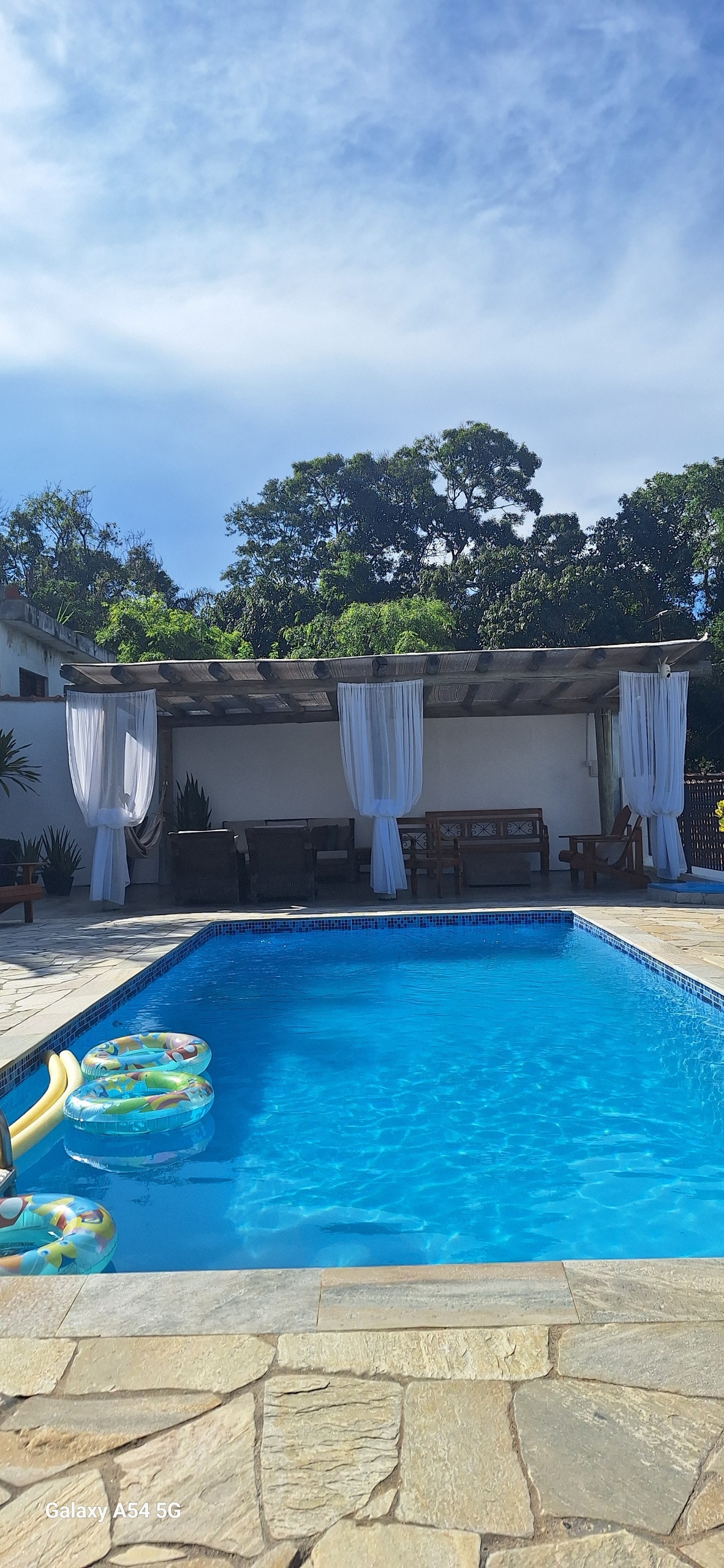 Fullkomið til að slaka á með fjölskyldu og vinum 🏡 Pláss fyrir allt að 15 gesti 🛁 3 baðherbergi og 1 baðherbergi 🚗 6 bílastæði 🏊♀️ Stór sundlaug (5x13m og 1,60m djúp) 🧖♀️Dry sauna 📶 Þráðlaust net og Netflix Uppbúið eldhús með 2 vatnssíum. 🥩Grill Rúmföt (fyrsta flokks) Loftræstikerfi í svefnherbergjum og stofu. Sport Fishing 🐟Lake Garður með ávaxtatrjám (pitanga, acerola o.s.frv.) Tilvalið umhverfi fyrir hvíld og tengingu við náttúruna.