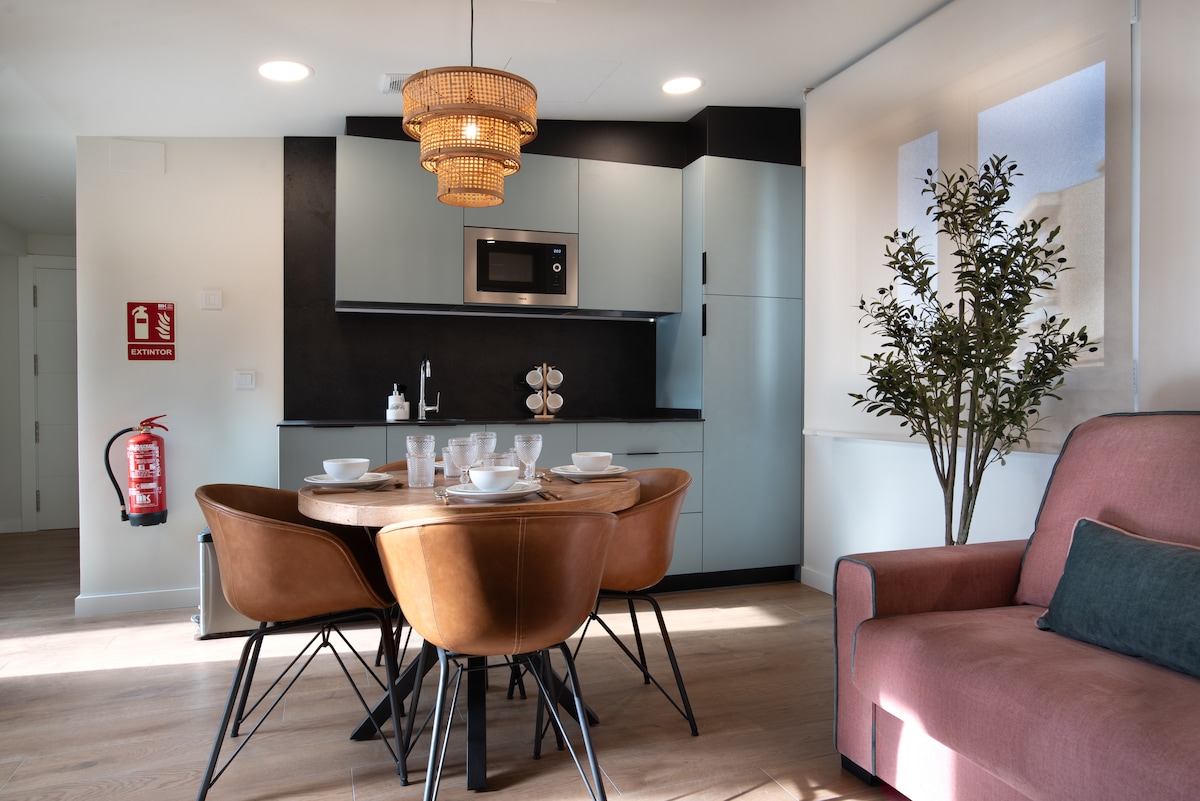 Njóttu þægindanna í þessari einstöku íbúð með 2 svefnherbergjum og 2 baðherbergjum og sólríkri verönd🌞, uppgerðri og fullbúinni til að láta þér líða eins og heima hjá þér. Þessi íbúð er fullkomlega staðsett á milli dómkirkjunnar og ráðhússins og er í stuttri göngufjarlægð frá táknrænum tapasgötum San Juan og Laurel, víngerðum á staðnum og garðinum við ána. Allt þetta í rólegu umhverfi🌙, án næturhávaða sögulega miðbæjarins og nógu nálægt til að njóta sjarmans.