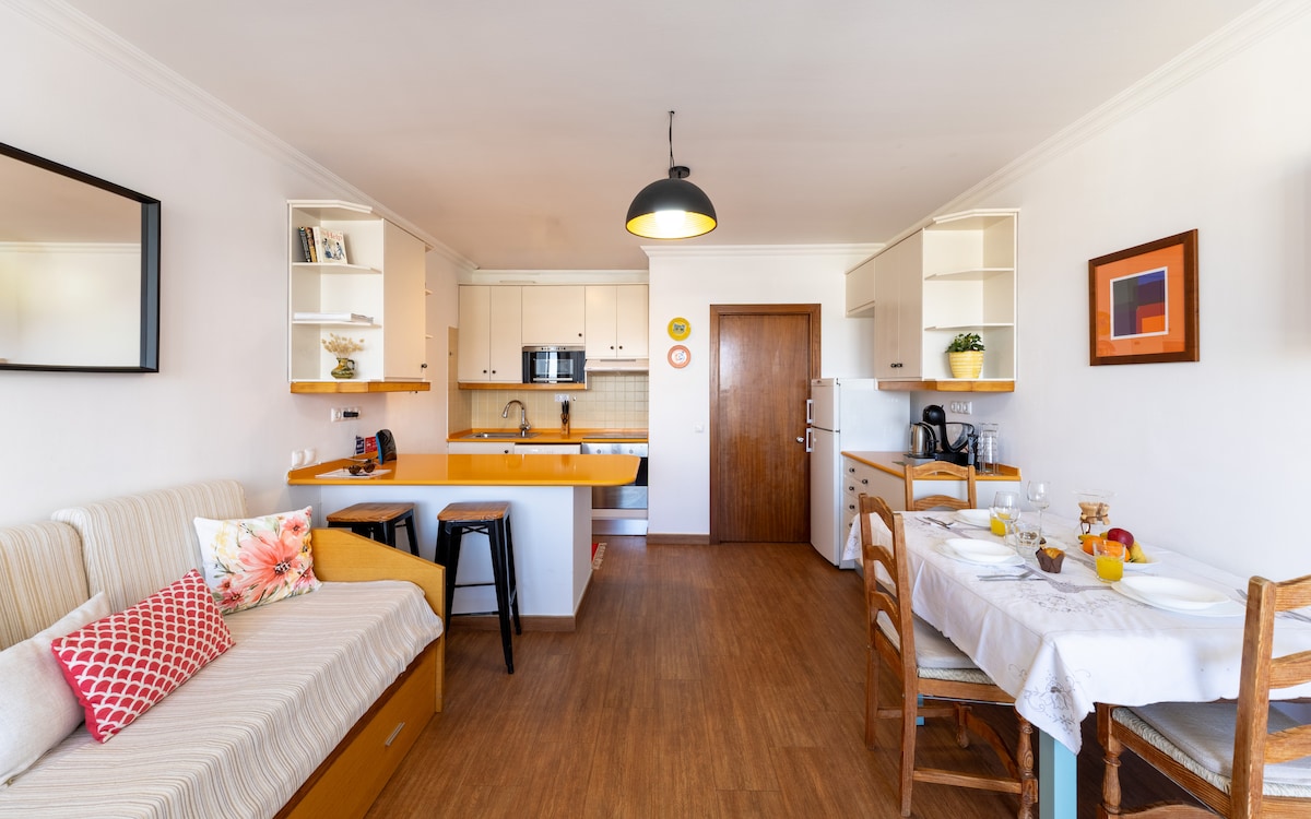 Við bjóðum þig hjartanlega velkominn í notalegu og stílhreina skálaíbúðina okkar sem er 113m ² að stærð. Hér getur þú farið í frí, unnið (á heimaskrifstofu) eða kynnst með allt að fjórum einstaklingum. Þrátt fyrir rólega staðsetningu er íbúðin staðsett í miðbæ Tavira. Fjölmargir veitingastaðir, kaffihús og menningartilboð einkenna þessa fallegu borg. Með ferjunni, sem er í aðeins 2 mínútna göngufjarlægð, er hægt að komast að Tavira-eyju með langri og hvítri sandströnd.