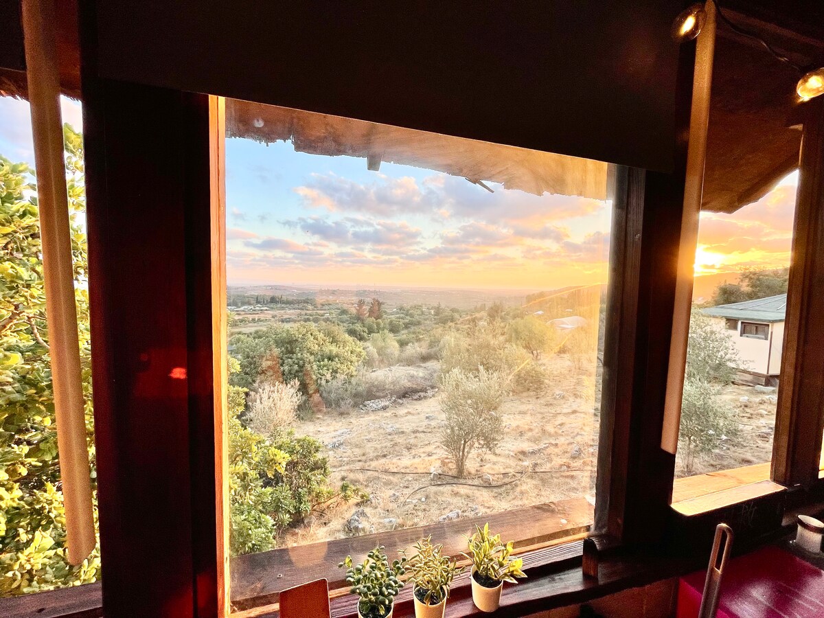 A magical cabin in a Galilean landscape, equipped with everything, overlooking the forest with an outdoor garden and a mountain view A pampering outdoor double bath Outdoor seating area, fire table TV with a variety of channels wifi Air conditioners in the bedroom and in the living room Fully equipped kitchenette Herbs in the garden for tea Nespresso machine sheets and towels, Hot water system Option for delicious double breakfasts