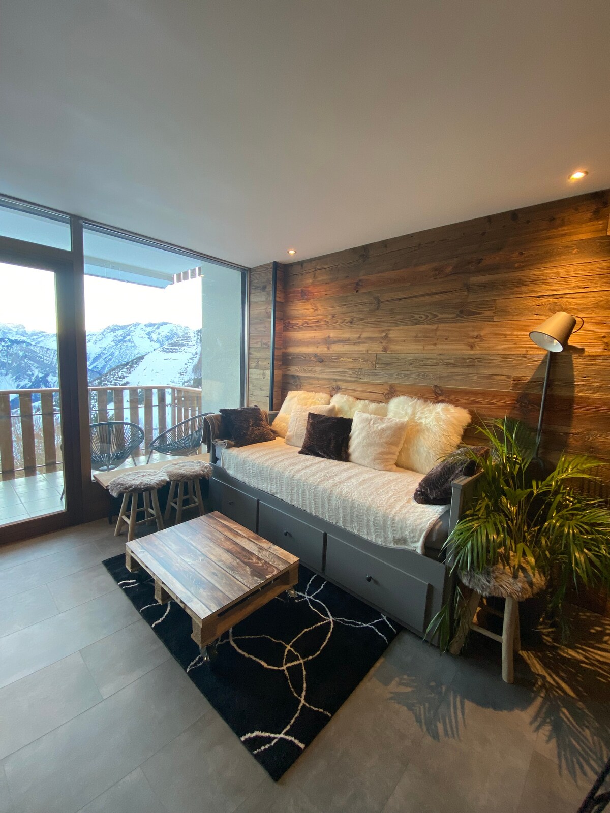 Fallegt stúdíó sem er um 32m2 að stærð, fullbúið í hreinum fjallaanda, mjög notalegt með stóru lokuðu svefnaðstöðu með 2 hjónarúmum 120x190cm/ baðherbergi með þvottaþurrku/sjálfstæðri snyrtingu/stofu með svefnsófa í 160x200 (dýna 18 cm þykk) /fullbúið eldhús/tengt sjónvarp/ókeypis þráðlaust net/svalir sem snúa í suður (1. hæð) / stórt öruggt bílastæði við hlið /skíðaskáp Framúrskarandi staðsetning á miðjum dvalarstaðnum.