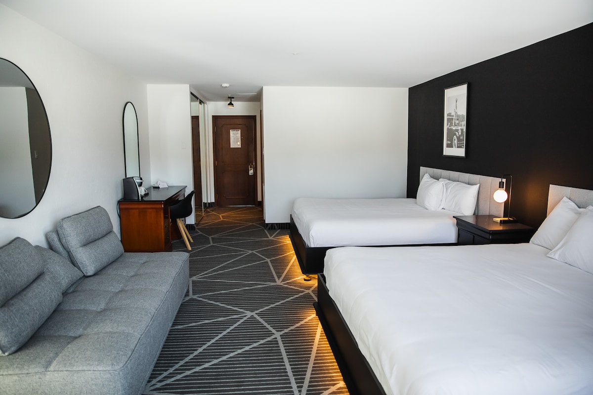 Svefnherbergi með tveimur rúmum á heillandi hóteli við vatnið