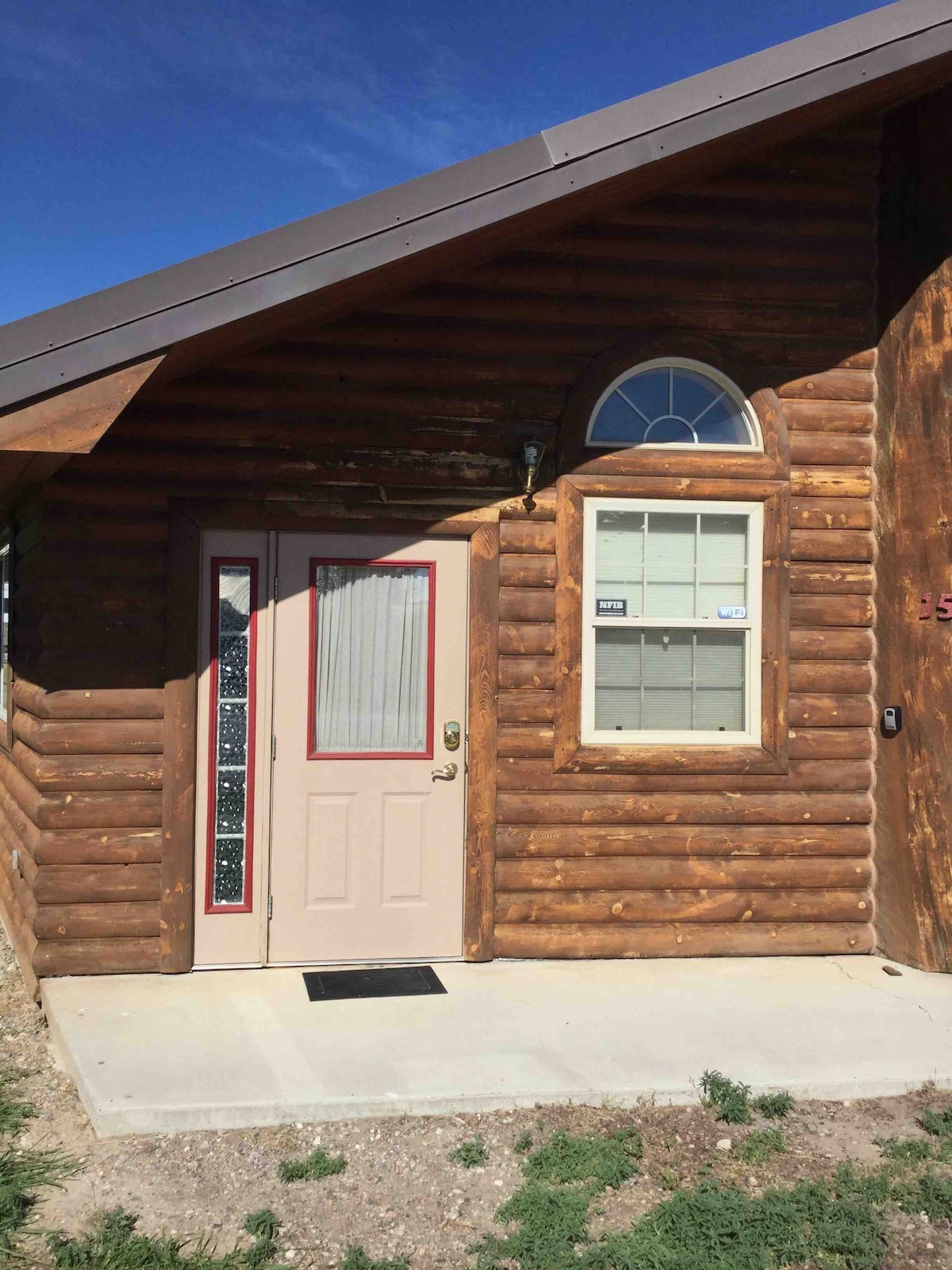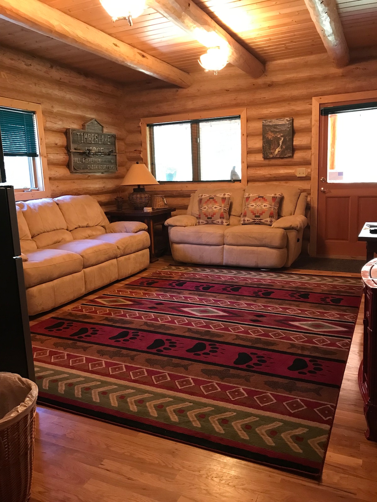 Þetta rými er svíta á jarðhæð sem er í boði á timburheimilinu okkar. Það er sérinngangur. Svefnherbergi með viðarrúmi í queen-stærð. Sérbaðherbergi með sturtu. Den svæðið m/ 43" flatskjásjónvarpi. Starlink internet WiFi. Bar svæði með litlum ísskáp, Keurig og örbylgjuofni. Þetta rými deilir sameiginlegum 12" þykkum timburvegg með dyragátt inn í aðalhúsið sem er lokað. Þrátt fyrir að við séum hljóðlát og virðing fyrir gestum sem við tökum á móti gætum við heyrt í venjulegum heimilishljóðum þar sem svítan er ekki hljóðeinangruð.