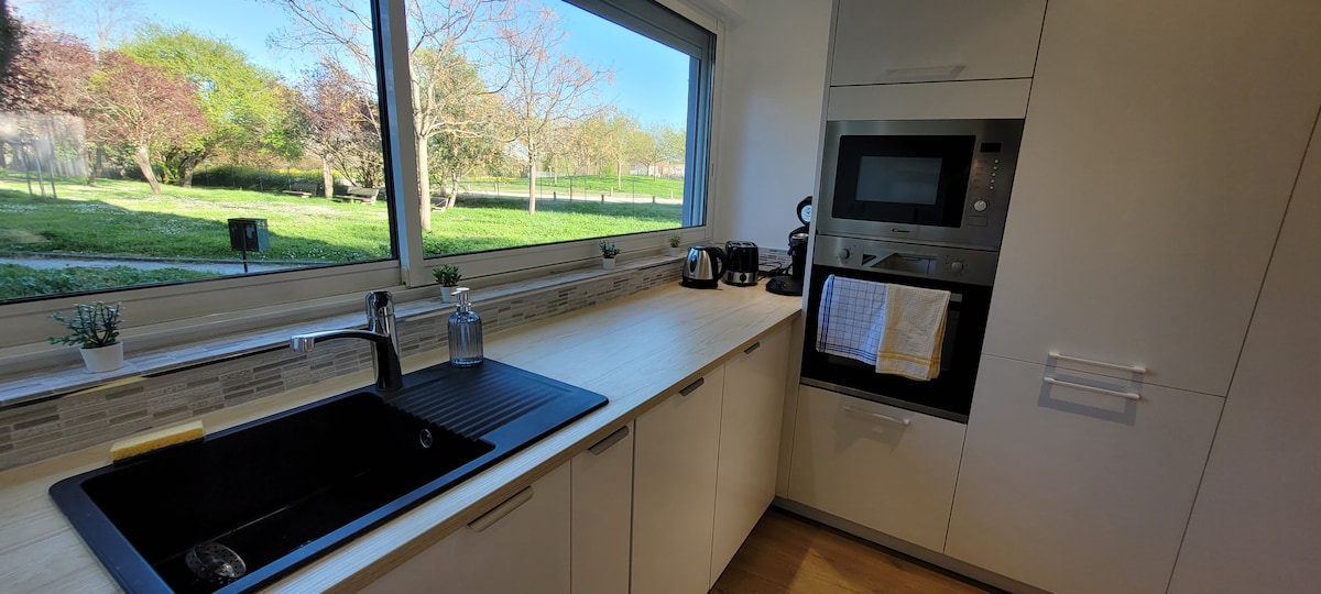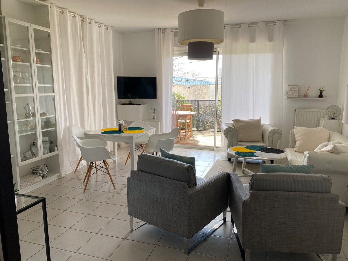 Íbúðin er staðsett á 2. hæð í grænu húsnæði við rætur neðanjarðarlestarinnar og verslana (í 1 mínútu göngufjarlægð!!). Íbúðin er glæsileg, rúmgóð og mjög vel búin fyrir stundir með fjölskyldu, vinum eða fyrir viðskiptaferðir. Eignin er rúmgóð T3, mjög þægileg fyrir notalega dvöl. Frábært til að heimsækja borgina Rose eða til að gista í viðskiptaerindum Bílastæði í kjallaranum, íbúðin er á annarri hæð án lyftu