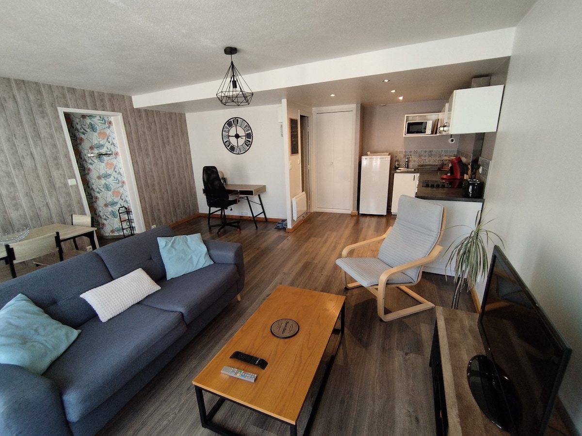 Líður þér eins og heima hjá þér í þessari hagnýtu 70m2 íbúð. Fullbúin íbúð með útbúnu eldhúsi (kaffivél, senseo, katli, raclette-vél, brauðrist, örbylgjuofni...) þvottavél, ísskáp með frysti, skrifborði, þráðlausu neti, barnastól, kögglaeldavél... Baðherbergi í hverju herbergi 1 svefnherbergi: 1 hjónarúm 1 svefnherbergi: 1 hjónarúm +1 rúm 1 pers * Athugaðu að rúmföt og handklæði eru ekki innifalin í leigunni * Ókeypis bílastæði