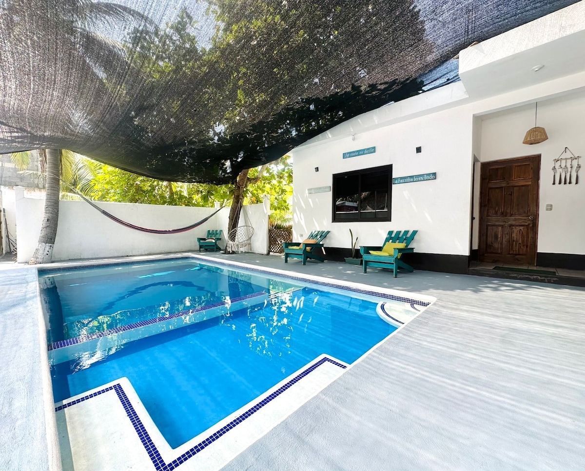 Si les gustan los atardeceres frente al mar, los ambientes naturales y la comodidad sin lujos, les encantará nuestra casa. Cuenta con piscina propia, 3 habitaciones con baño propio (4 personas por habitación), palmeras y una vista espectacular. Nuestra casa tiene agua dulce que proviene de un pozo cercano. La piscina también es de agua dulce. La cocina de la casa está muy bien equipada. Renovamos con frecuencia ollas, sartenes, cubiertos y otros para que siempre estén en óptimas condiciones.