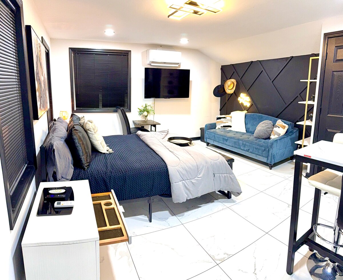Njóttu rólegs og nútímalegs afdrep sem er hannað fyrir viðskiptaferðamenn, fagfólk og langdvöl. Heimilið býður upp á þrjú rúm í queen-stærð með úrvalsaðstöðu, sófa og svefnsófa sem hægt er að breyta í rúm og hugleiðslustóla fyrir sameiginleg gistirými. Njóttu baðherbergisins sem er innblásið af heilsulind með regn- og handsturtum, bláleysu steinefni sem skapar afslappandi andrúmsloft, björtu sólstofu og einkaverönd með körfuboltahring til að skemmta sér. *Inniheldur veituþjónustu og mánaðarlega ræstingu.