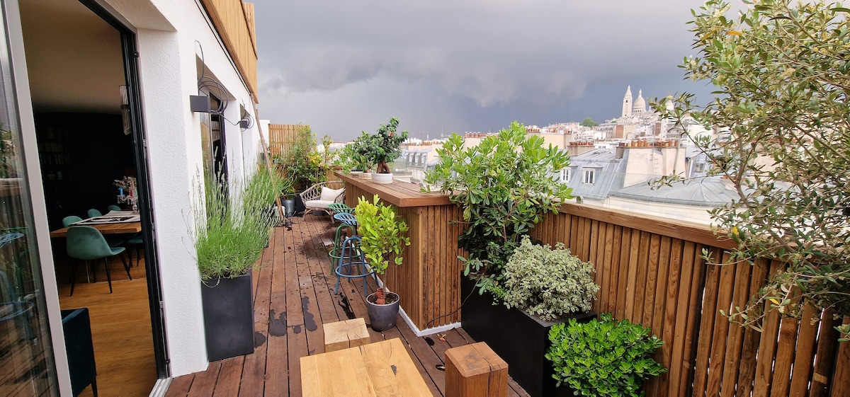 Design loft apartment (50 m²) with a large private terrace (40 m²) in a lively and authentic Parisian district, between Mouffetard and Butte aux Cailles. Björt stofa, þægilegur sófi, Bose hátalari, sjónvarp, fullbúið eldhús. Svefnherbergi uppi með queen-rúmi og fatnaði. Sturta í ítölskum stíl, aðskilin snyrting, rúmföt, hratt þráðlaust net og þvottavél. Friðsælt og stílhreint afdrep fyrir tvo eða vinnuferð.