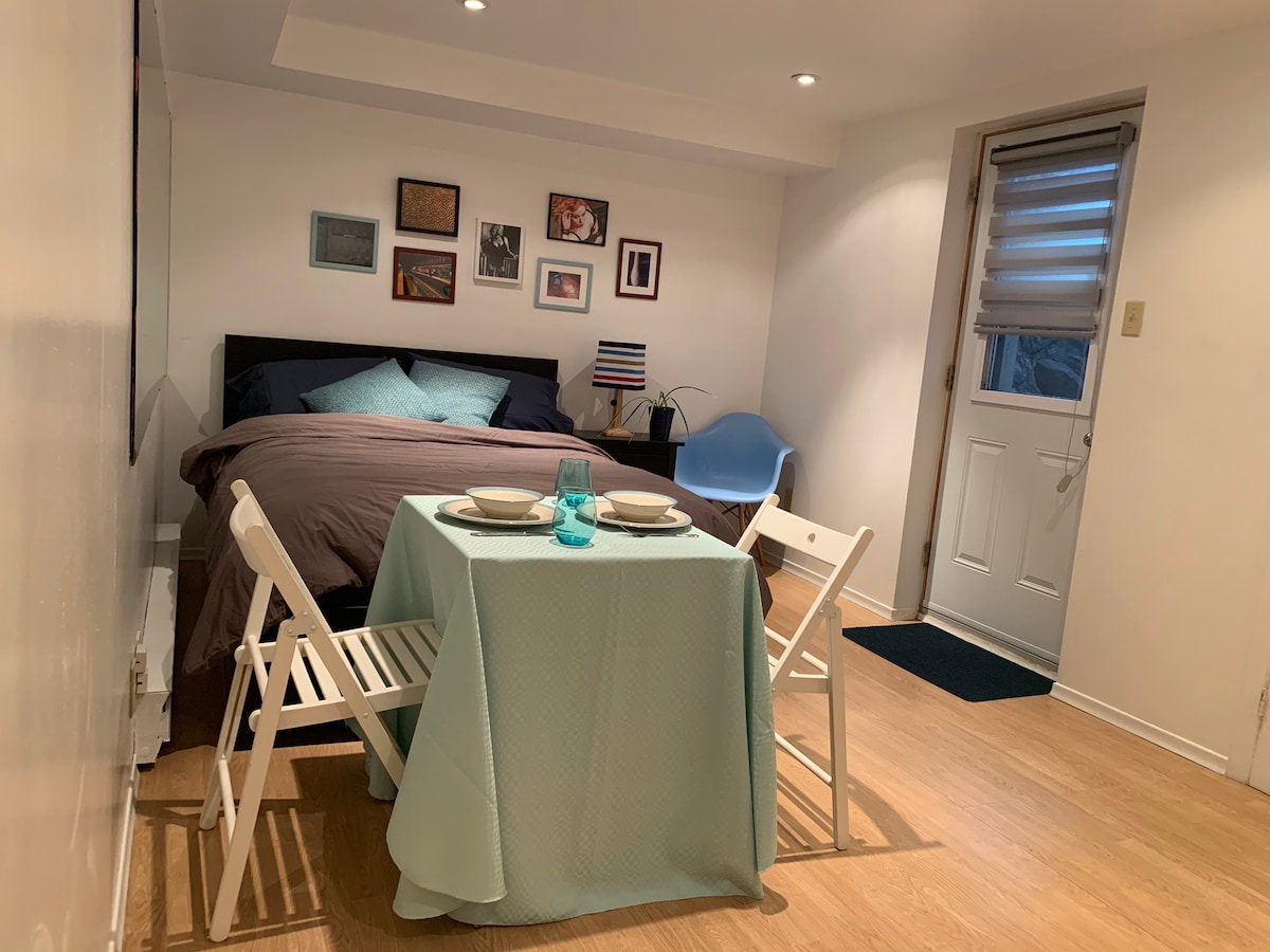 Private fully furnished room with separate entrance in my home in a lovely, quiet neighborhood in Laval. It's perfect for couples, students, and professionals who want a good night's sleep while being well situated. Place Bell is located less than 2 minutes by walking, while the Montreal Metro is 5 mins away on foot. By Metro, downtown Montreal is located 30 mins away. For your convenience; a microwave, counter, dishes, cutlery, mugs, toaster, mini-fridge, and kettle are available. CITQ: 304959