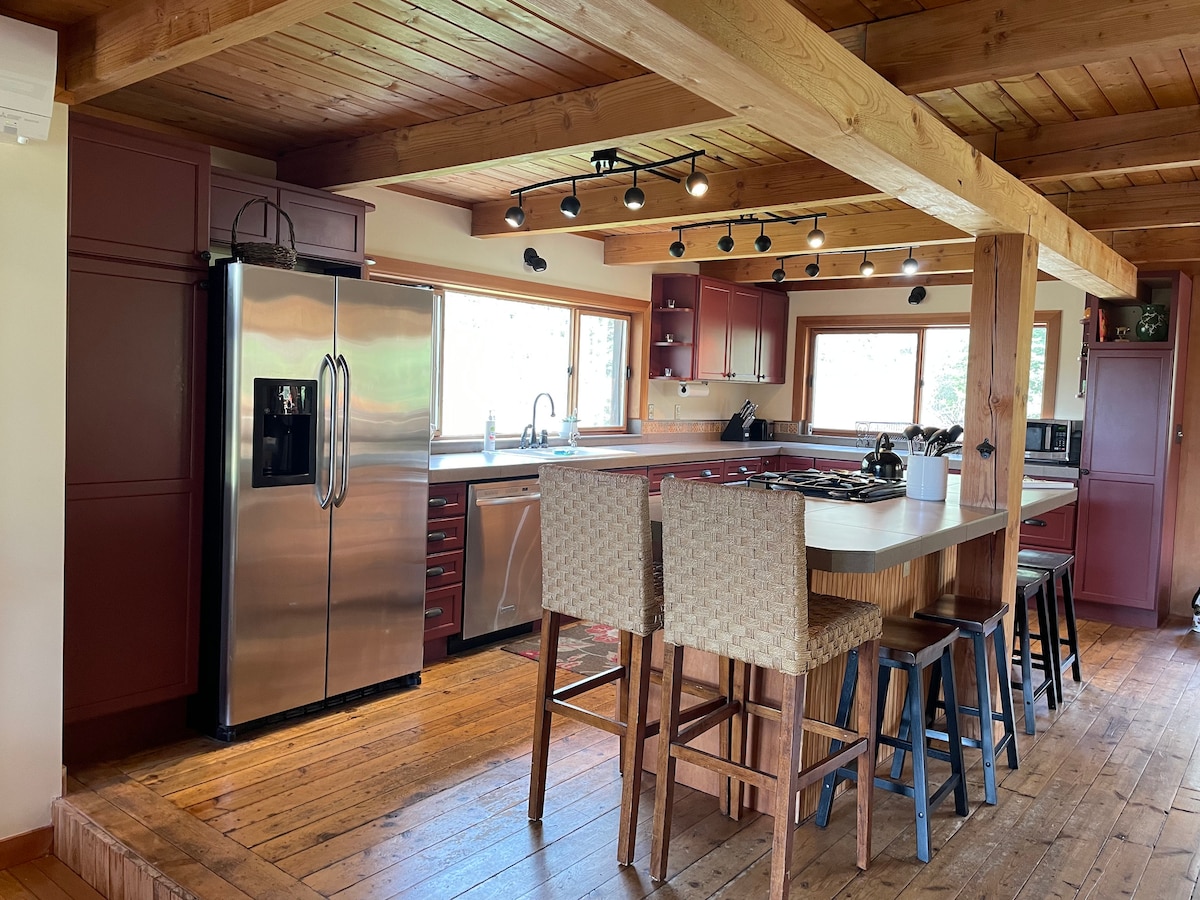 Ræsa leit að hléi á þessu einstaka jarðhúsi. Notalega afdrepið var handhægt með staðbundnum og sjálfbærum náttúrulegum efnum og þar er að finna miðlæga stofu með tröpputröppum sem liggja að svefnherberginu. Gestir hafa aðgang að öllum bústaðnum og eigninni í kring. Við búum í nærliggjandi húsi og okkur er ánægja að gefa ráð eða svara spurningum til að hjálpa þér að fá sem mest út úr dvölinni. Hverfið er nokkuð dreifbýlt og að mestu landbúnaður með nokkrum býlum og litlum einkavíngarði. Heimilið er í 10 mínútna göngufjarlægð frá ströndinni og í 20 mínútna göngufjarlægð frá matvöru fyrir fjölskylduna og delí sem sérhæfir sig í lífrænum vörum frá staðnum. Mayne Island er með litla samfélagsrútu. Tímar og leiðir eru takmarkaðar, sérstaklega á veturna. Hún stoppar við innkeyrsluna. Við erum einnig með opinbert hitch göngukerfi með undirrituðum bílstoppum þar sem þú getur beðið eftir ferð. Þú þarft yfirleitt ekki að bíða lengi. Okkur er ánægja að bjóða upp á akstur og skutl á ferjubryggjuna sem kurteisi til að hvetja bíllausa ferðamenn, þá daga sem samfélagsrútan er ekki í gangi. Vinsamlegast láttu okkur vita fyrirfram að þú munir koma án eigin samgangna og við munum passa að annaðhvort við eða samfélagsstrætóinn (sem skutlar þér í innkeyrsluna) sé á staðnum til að hitta þig þegar ferjan kemur. Auðvelt er að nálgast BC ferjuhöfnina nærri Victoria og Vancouver með almenningssamgöngum frá viðeigandi flugvöllum og miðborgum.