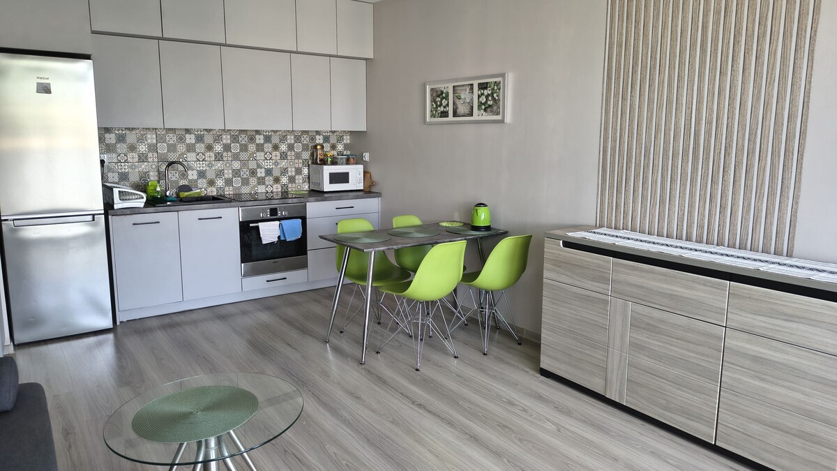 Ég leigi nútímalega 43m2 íbúð nálægt miðbænum. Íbúðarblokk tekin í notkun árið 2020. Íbúðin samanstendur af: ~ stofu (sófa, borð, kommóða, sjónvarp) ~ eldhúskrók (borð með stólum, ísskápur, helluborð, ofn, uppþvottavél, gufugleypir, rafmagnsketill), ~ svefnherbergi (stórt rúm, borð), ~ forstofa (með spegli og skáp, borð) ~ baðherbergi (sturtu og þvottavél), ~ svalir. Gestir geta notað WiFi ókeypis á staðnum.