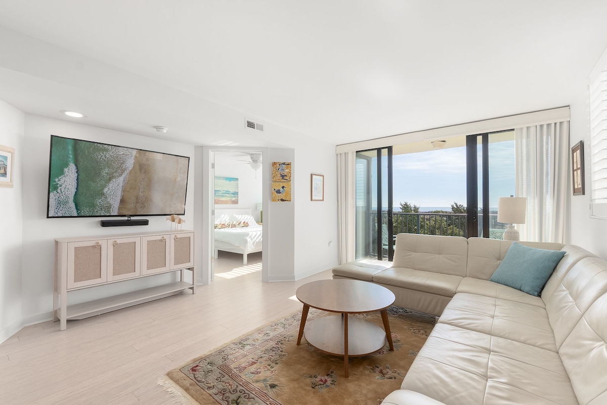 Stórkostleg íbúð á efstu hæð með mögnuðu útsýni til allra átta frá bæði svölunum og stofunni. Þessi 650 sf, 2 svefnherbergi/ 2 baðherbergi er steinsnar frá ströndinni og sundlauginni. Frábær þægindi eru innilaug, útilaug með 150 vatnsrennibrautum, heitir pottar, tennis- og körfuboltavellir, leikvöllur og fleira. Hlustaðu á hafið af svölunum okkar og fylgstu með höfrungunum leika sér! Við elskum paradísarsneiðina okkar og viljum endilega deila henni með þér!