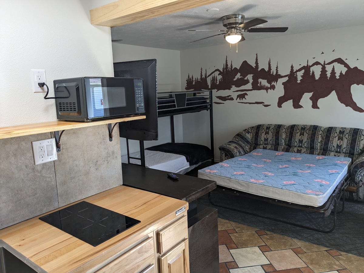 Enjoy my stylish and cozy duplex I just finished remodeling! This is the lower basement level. You have a small bar with granite countertop, microwave, mini fridge and keurig coffee maker. Living room with smart TV. Walk-in shower and high speed internet! Great for a single or couple who doesn’t plan on cooking. Located in old town Pocatello next to city creek trail system. Great for hiking and biking! READ FULL description and HOUSE RULES before booking for a successful stay!
