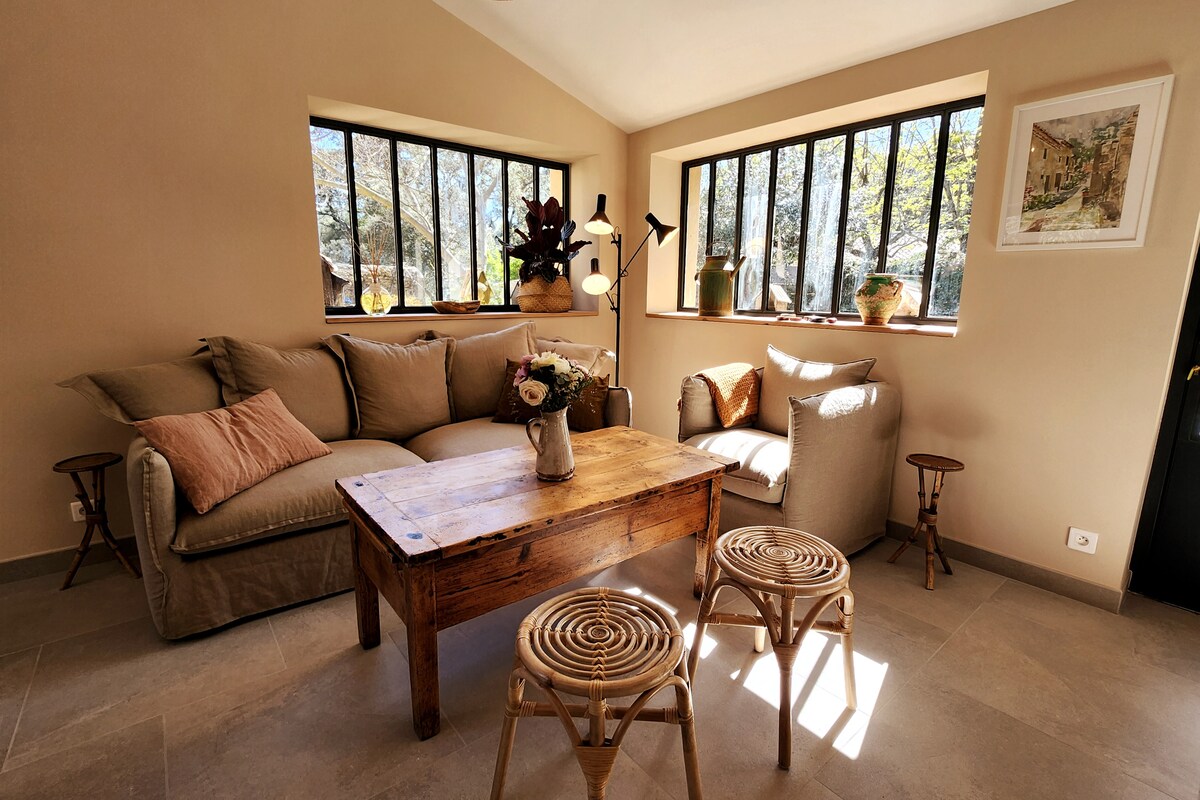 Lulled af lykt af blómlegu lavender, timian, jasmine, suðrænum jurtum og cicadas syngja, staðsett efst á "collinette" í skugga furutrjáa, býður þér mest stórkostlegt landslag. Um leið og þú vaknar verður þér sökkt í akrana í kring, skreyttir appelsínugulum litum af frábærri sólarupprás, til að velta fyrir þér úr rúminu þínu þökk sé stórum gluggum heimilisins sem ná frá gólfi til lofts.