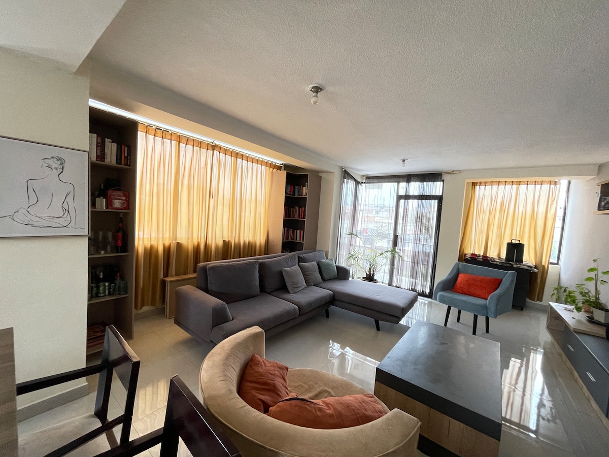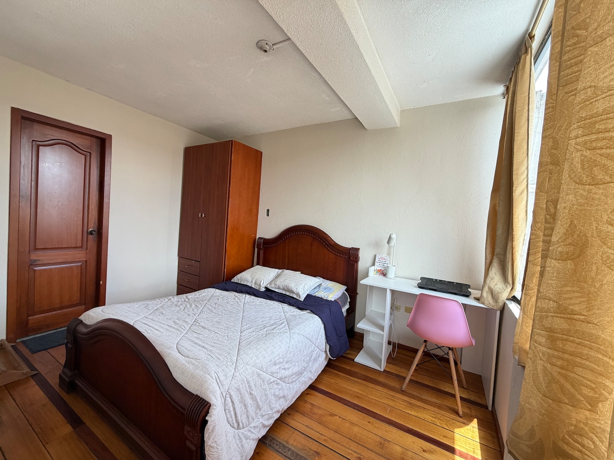 Þessi íbúð er rúmleg, nútímaleg og nýuppgerð og býður upp á þægilega og bjarta stemningu fyrir fjölskyldur, hópa eða ferðamenn sem þurfa á vinnustað og hvíld að halda. Það er með 2 svefnherbergjum, queen size rúmi, þráðlausu neti, vel búna eldhúsi, snjallsjónvarpi og fleiru. Það er staðsett á Av. Pedro Vicente Maldonado, tveimur húsaröðum frá ESPOCH bensínstöðinni, á öruggu og rólegu svæði, með verslunum og veitingastöðum í nálægu umhverfi. Þaðan er einnig fljótur aðgangur að miðbænum og Bicentennial-garðinum.