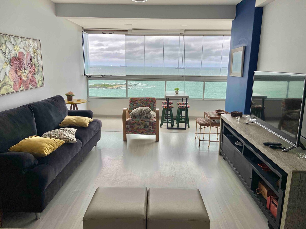 Amazing Beach View Apartment in Praia da Costa! Spectacular view, Gourmet balcony with Barbecue, Full equipped kitchen with cooktop, refrigerator/freezer, microwave and electric coffee maker. 2 bedrooms with air conditioning, TV and desk for work/study right by the beach. The living room also has Air Conditioning and 65'' Samsung Smart TV. Ideal for relaxing and enjoying toe paradise 100% oceanfront. Towels and bed linen provided for all guests. Bathroom with hot shower. 🌊🏝️
