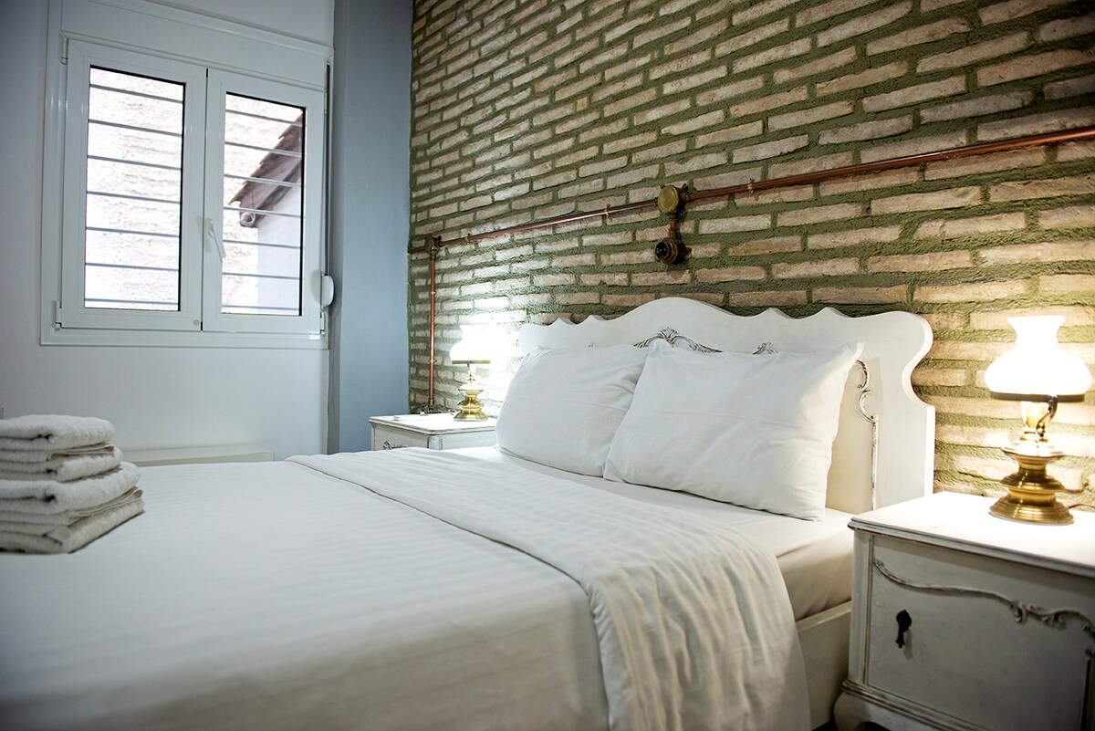Upplifðu tímalausan glæsileika í Afrodite Suite. Vandlega hannaða svítan okkar býður upp á fullkomna blöndu af nútímalegum lúxus með fornum sjarma. Svítan okkar er einstaklega sérsniðin með hlýlegri innilýsingu og ljóma arinsins og skapar mjúkt og duttlungafullt umhverfi. Eignin er búin framúrstefnulegum kerfum og mjúku rúmi fyrir bestu þægindin. Njóttu næturinnar, slakaðu á við arininn og sökktu þér í menningu og gestrisni á staðnum.