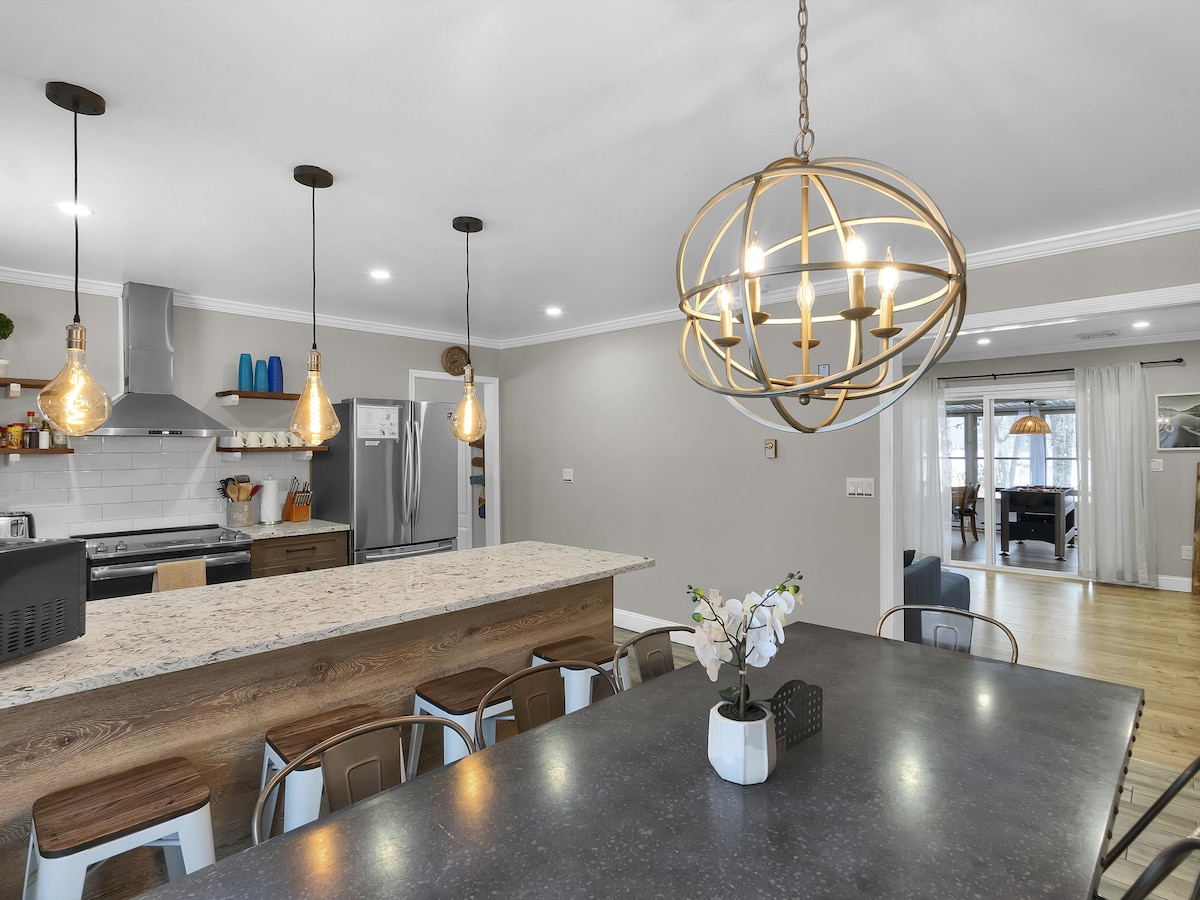 Verið velkomin í Oak View, bjarta draumaferðina okkar með skandinavísku innblæstri. Það gleður okkur að fá þig í eignina okkar og við vonum að þú munir elska hana jafn mikið og við gerum. Oak View er afslappandi og friðsæll staður og býður upp á marga sérstaka muni, þar á meðal viðareldavél frá miðri síðustu öld, Sonos-hátalara, risastórar rennihurðir, eldstæði utandyra og friðsælt skógarútsýni. Minna en 20 mínútur frá vatnagörðum innandyra, dvalarstöðum og fylkisgörðum!