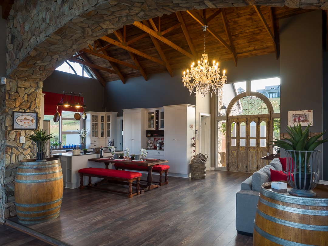 Highland Gate Guesthouse | Near Dullstroom This 5-star superior luxury home is situated on Highland Gate Golf Estate, 2.5 hours from Johannesburg, ideal for 8 golfers or 4 couples. 4 en-suite bedrooms + outdoor bunk room, fully equipped kitchen, bar, lounge, TV with fireplace, wine cellar, Wi-Fi, gas & wood-fire braai. Family-friendly with jumping castle for kids, Perfect for golf, relaxation, and a mountain escape with spectacular view of the Waterfall next to the house and mountains