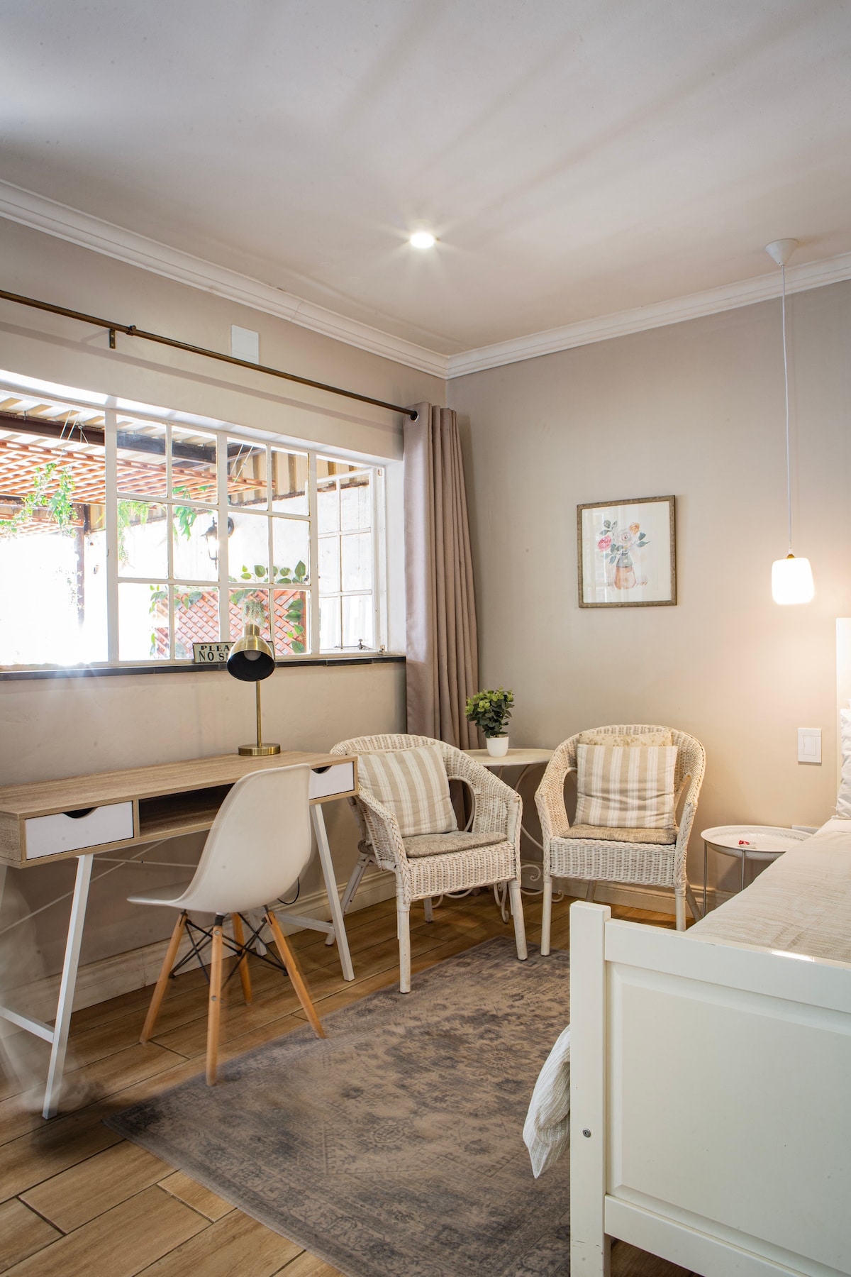 Forget your worries in this spacious and serene cottage located on 1 hectare small holding bordering private reserve with hiking & mountain biking trails. The tranquil setting creates a feeling of being on a farm despite being on the outskirts of the city. Expansive garden with pool, braai area and stoep to relax & de-stress. 10 mins to N1 & N4 highways. 5-10 mins to schools, hospitals, churches, gym and restaurants. The new Linton's corner shopping center is less than 5km away.
