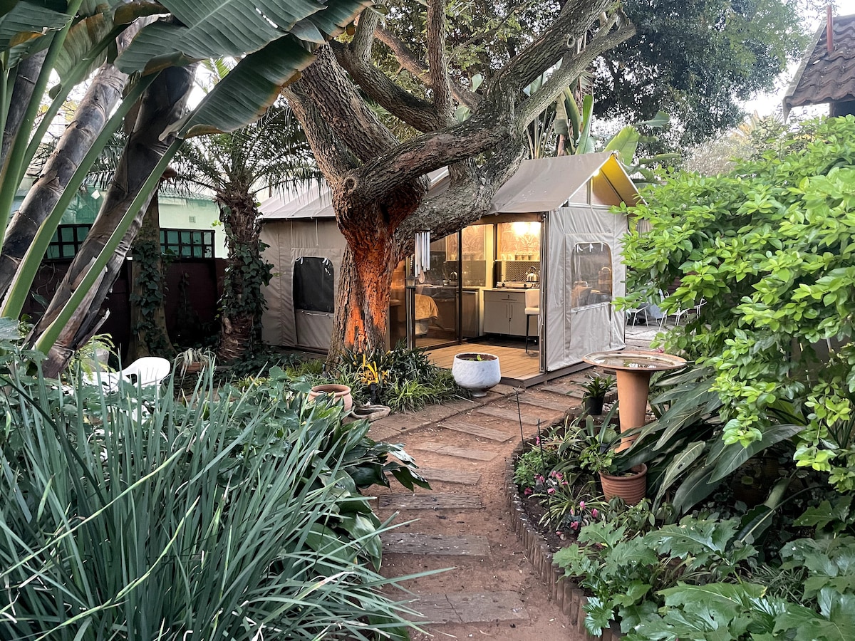 This is a unique unit, totally "off-grid" which is solar powered. Get away from it all when you stay under the stars. This is a unique permanent tent, located in our luscious Tropical Garden. You can wake up to the sound of the wild birds, open the sides and enjoy the garden view from your super comfortable double bed.
