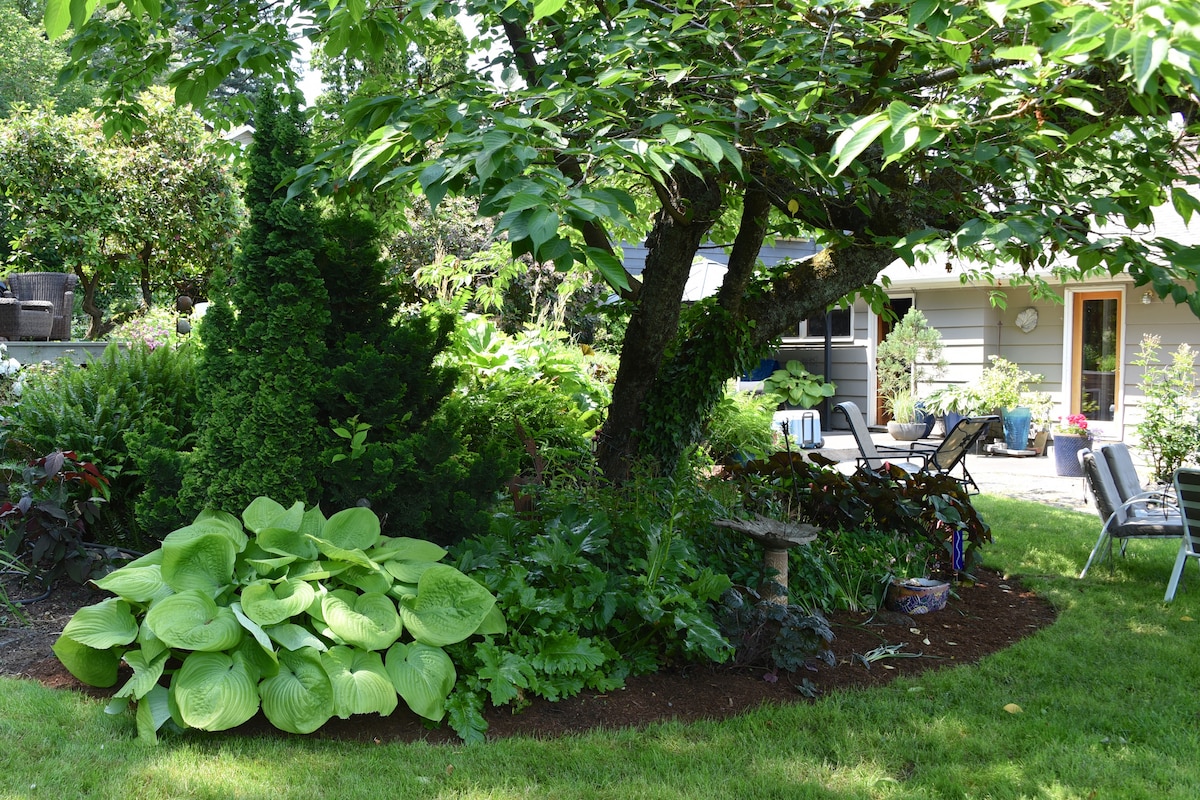 Heillandi, skóglendi, rúmgóð eins svefnherbergis kjallaraíbúð. Stórt fullbúið eldhús, baðherbergi, þvottavél og þurrkari, stofa með gasarinnlegg. Einka, auðvelt aðgengi, upplýst inngangur. Þægilegur aðgangur með rútu til miðbæjar Portland og flugvallar. Inniheldur fallega landslagshannaða lóð, verönd og aðgang að Mt. Tabor garður með hlaupum, hjólreiðum, gönguleiðum og tennisvöllum.