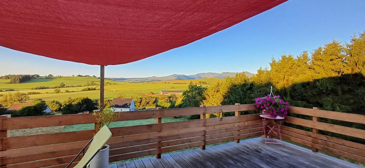 Staðsett í Volcanoes í Auvergne Park, og á einkafjölskyldueign, komdu til að hvílast í bústaðnum okkar beint fyrir framan Volcanoes Chain víðáttumikið útsýni. 40 fm viðarheimilið okkar samanstendur af stofu með fullbúnu eldhúsi sem snýr að stórri verönd að hluta, 2 svefnherbergjum (1 rúm 140 + 2 rúm 80), baðherbergi, aðskildu salerni. Rúmföt og handklæði eru til staðar.