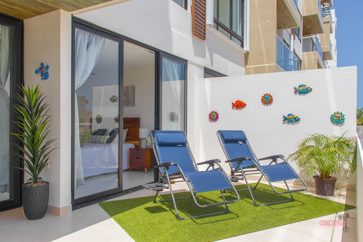 Vaknaðu við mest töfrandi útsýni yfir kristaltært grænblár vatn af mexíkóska Karíbahafinu við þessa glæsilegu íbúð með 1 svefnherbergi við sjóinn sem er á jarðhæð Sotavento - engir stigar/auðvelt aðgengi. Í boði: Jógamottur, líkamsræktarstöðvar, snorklbúnaður, strandleikföng, borðspil, nestiskarfa, Nuddrúm, gólfstíðabúnaður, gufutæki í bílskúr, farangursgrind. Í göngufæri frá mörgum veitingastöðum/strandklúbbum. **VERÐ ER BREYTILEGT ALLT ÁRIÐ SVO ATHUGAÐU VERÐIÐ FYRIR BÓKUNARDAGSETNINGAR ÞÍNAR * **
