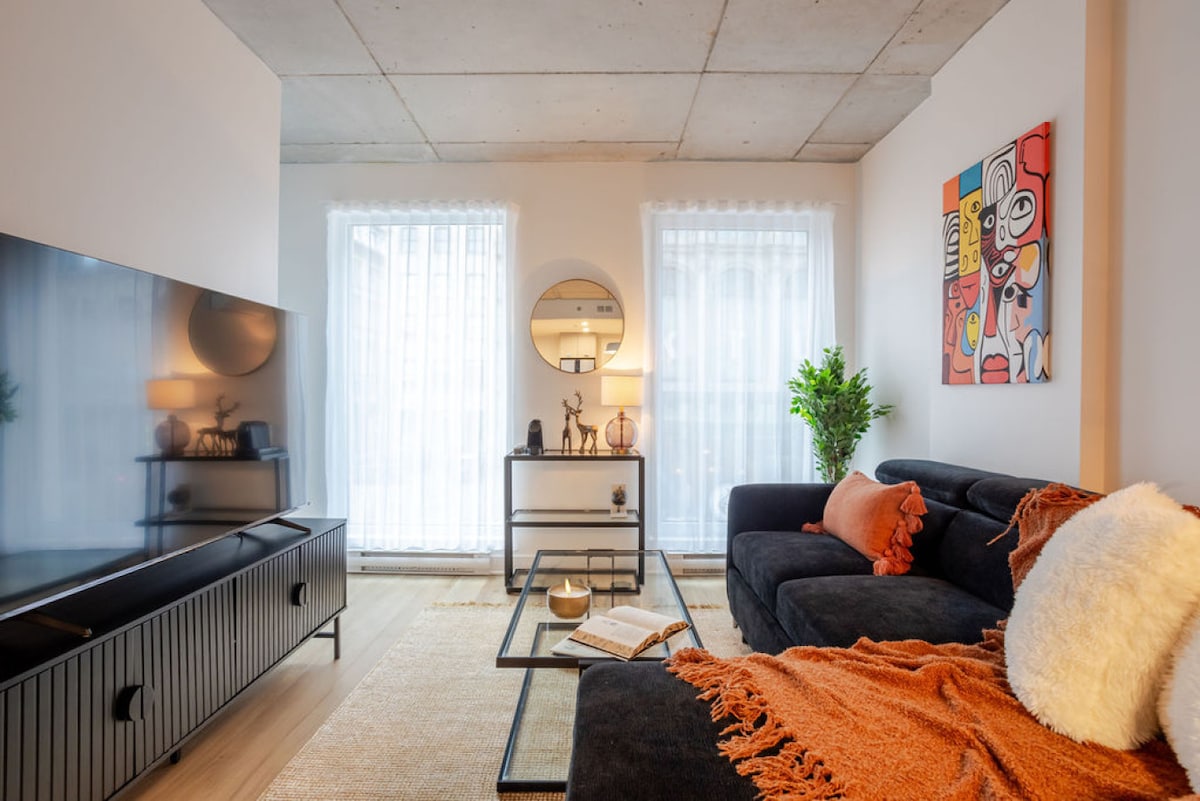 Savvy er rúmgóð lúxusíbúð með 1 svefnherbergi í hjarta gamla hafnarinnar í Vieux-Montréal, nokkrum skrefum frá veitingastöðum og árbakkanum, þar sem allt að 4 gestir geta sofið í þægindum. Fullkomið fyrir vetrarferðir, fjölskylduferðir, vinnuferðir, viðburði í Palais des congrès eða fágaða einnar nætur dvöl. Með háum loftum, sögulegum múrsteinum, glæsilegum innréttingum og svefnherbergi sem snýr að friðsælli húsagarði, er þetta eins og hönnunarhótel en samt með fullkomnu næði, úrvalsþægindum, hröðu þráðlausu neti og 5-stjörnu gestgjafa til að þjónusta þig.