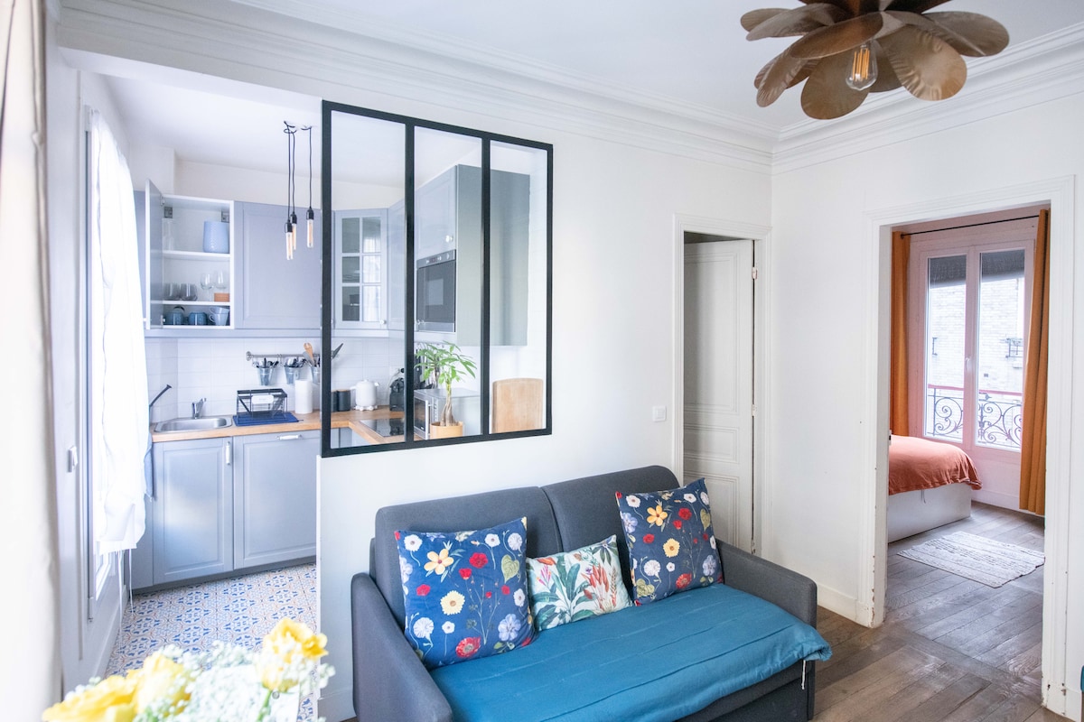 Þessi bjarta íbúð í hjarta Montmartre, rómantískasta hverfi Parísar, er fullkomlega staðsett en kyrrlát gata (2 mínútna göngufjarlægð frá Sacré Coeur og Place du Tertre) mun gera dvöl þína í París ógleymanlega. Fullbúið (rúm í king-stærð, heimabíó, vínylspilari, þvottavél, handklæði, hárþurrka o.s.frv.). Í eldhúsinu er allt sem þú þarft. Hafðu samband við mig ef þú hefur einhverjar spurningar :)
