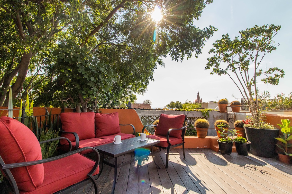 Hæsta veröndin í öllu hverfinu - Casa de las Nuebes (hús í skýjunum) mun ekki valda vonbrigðum! Fullkomið paraferð eða tveir vinir. Þetta fallega stúdíó í eigu innanhússhönnuðar býður upp á alla þá töfrandi eiginleika sem gestir elska við San Miguel. Gakktu aðeins nokkrar mínútur frá Centro að afgirtri 6 íbúða íbúð sem er mjög örugg og í burtu frá hávaðanum í miðbænum. Njóttu hins stórkostlega 360 gráðu útsýnis yfir loftbelg, sólsetur og sma!