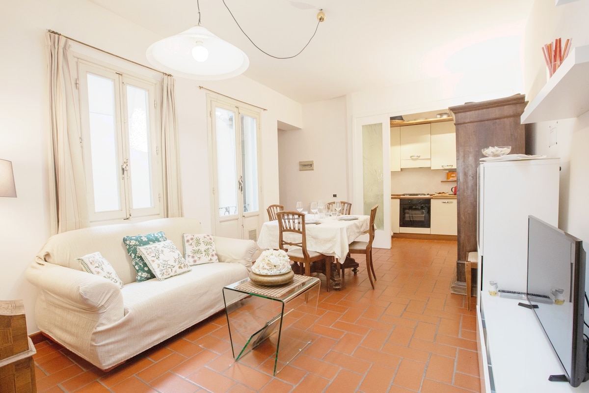 Questo bello e luminoso appartamento si trova al terzo piano di un palazzo fiorentino senza ascensore in via del corso, a pochissimi passi dal duomo, nel pieno cuore della città, vicinissimo a tutte le attrazioni che Firenze ha da offrire. This beautiful and bright apartment is on the third floor of a Florentine building without an elevator on Via del Corso, in the heart of the old town in an Italian neighbourhood a few steps from the Duomo - Cathedral. Ideally located with all main monuments, squares and museums: the Duomo, Palazzo Vecchio, the Uffizi, Ponte Vecchio and Santa Croce a short walk away. L'appartamento completamente in parquet è composto da salotto, cucina, bagno, camera matrimoniale e terrazza: può ospitare quattro persone grazie al divano letto posizionato in salotto. The apartment has beautiful wooden floors through out, with a living room, kitchen, bathroom, 1 bedroom and terrace, and can comfortably sleep four people with a sofa bed in the living room. La zona giorno molto luminosa grazie alla grande finestra è composta da un comodo divano letto, tavolo in legno con quattro sedie e comodini, mentre l'adiacente cucina è dotata di tavolo da pranzo per quattro persone, oltre che di tutto il necessario per cucinare i vostri piatti preferiti anche in vacanza. The living area is very bright with large windows and occupies a comfortable sofa bed, wooden table for four, as well as an adjacent kitchen with a dining table for four people, with everything you need to cook your favorite dishes whilst on vacation. Proseguendo per il corridoio troviamo il bagno con pavimento in cotto che dispone di due lavandini, bidet e cabina doccia. Continuing along the corridor there is a bathroom with tiled floor which accommodates two sinks, a toilet, bidet and shower. The bedroom is bright with glass doors leading to the terrace. It is furnished with a large double bed, bedside tables, wardrobe, bookcase, mirror and desk. La camera da letto è luminosissima grazie alla porta finestra, ed è dotata di un grande letto matrimoniale, comodini, armadio, libreria, specchio e scrivania. Dalla porta finestra della camera da letto accediamo alla bellissima terrazza esterna, che offre agli occhi uno spettacolo mozzafiato: un panorama sui tetti di Firenze e una visuale perfetta del Duomo. La terrazza è attrezzata con tavolino e sedie per rilassarvi e godervi la bellezza della città anche da casa ad ogni orario. From the bedroom window/door you can access a fantastic outdoor terrace, which offers a breathtaking panorama of the rooftops of Florence, and a glorious view of the Cathedral. The terrace has a table and chairs so take a break, sip on a glass of wine at the end of the day and watch the city transform as the day ends. Questo magnifico appartamento è la scelta ideale per coloro che desiderano soggiornare in una location nel vero cuore pulsante della città. Con questo appartamento avrete l'occasione di vivere a pieno la vita dei quartieri del centro storico, raggiungere a piedi in pochi minuti i principali monumenti,piazze e musei: il Duomo, Palazzo Vecchio, gli Uffizzi, Ponte Vecchio e Santa Croce si trovano tutti a pochissima distanza, in un quartiere vitale, ricco di negozi, ristoranti, caffè, botteghe, musei e in generale tutto ciò che potrebbe servirvi durante la vostra vacanza a Firenze. This fabulous apartment is the ideal choice for those wishing to stay in a location in the very heart of the city with shops, restaurants, cafes, museums and generally anything you may need during your vacation in Florence, a few minutes walk away.