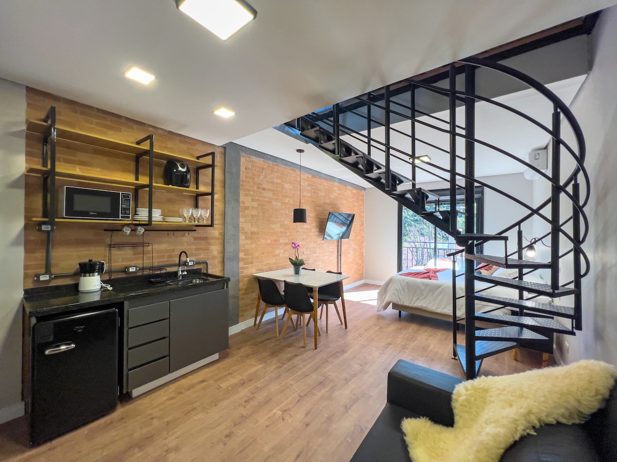 Loft með Mezzanine, fallegt nútímalegt rými, að vera tvö hjónarúm Queem og svefnsófi, tvö fullbúin baðherbergi og mjög nálægt ferðamannamiðstöð Campos do Jordão, eldhús útbúið fyrir snarl og jafnvel litlar daglegar máltíðir, við erum aðeins 700 metra frá miðbæ Vila Capivari, þar sem hægt er að ganga, neðst í byggingunni er heillandi veitingastaður (Moringa) með ljúffengum valkostum af réttum, þeir þjóna einnig morgunmat.