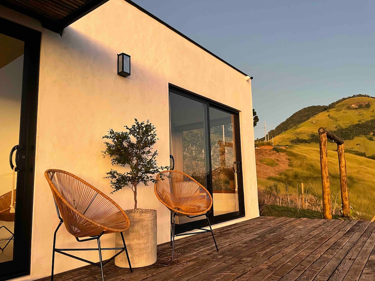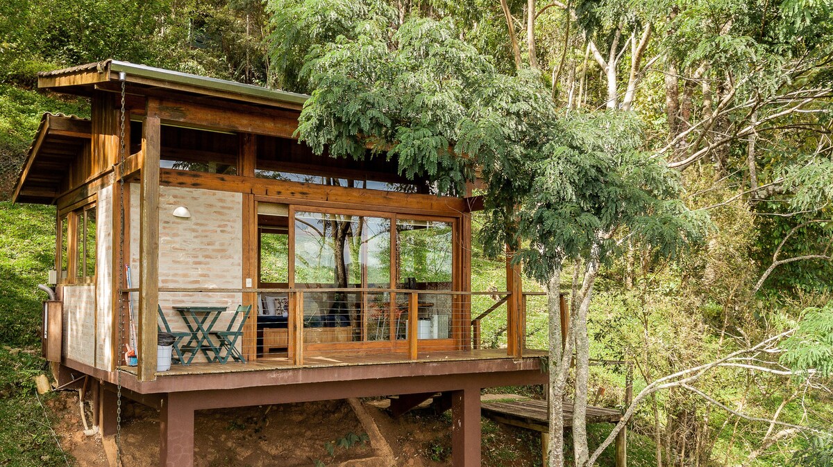 Kynnstu sjarma Serra da Mantiqueira í kofa sem er hannaður þannig að þú getir horft á sólarupprásina án þess að fara úr rúminu. Slappaðu af í upphituðu heilsulindinni okkar, stjörnuskoðun á loft- og sveiflunetinu. Í cabana er sambyggt herbergi með notalegu Queen-rúmi. Í stofunni/eldhúsinu rúmar mjög þægilegt fúton tvo gesti í viðbót og því er upplifunin tilvalin fyrir fjölskyldur. Í eigninni eru einnig slóðar og litlir fossar.