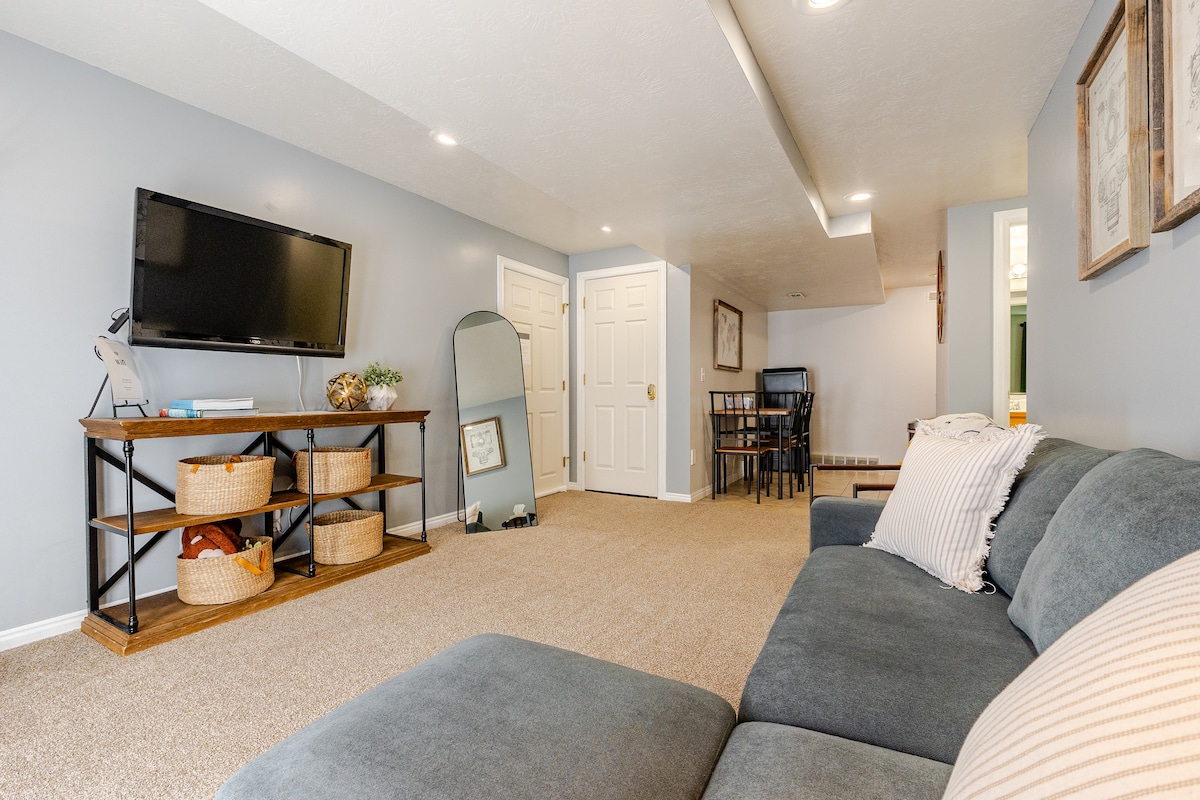 Það getur verið ÓÞÆGILEGT að vera að heiman! En það þarf ekki að vera. Þessi yndislega kjallaraíbúð er fullkomin hvort sem þú ert að heimsækja fjölskyldu, vinna í fjarvinnu eða þarft að gista eina nótt í burtu. Þú færð tilfinningu fyrir hönnunarhóteli með næði í rólegu hverfi og öllum þægindum heimilisins (bílastæði með vandræðalegum inngangi í bakgarðinum, fullbúnu eldhúsi og þvottahúsi, Zoom-vænni vinnuaðstöðu o.s.frv.). AUK ÞESS ertu miðsvæðis í sýslum Utah og Salt Lake og í nokkurra mínútna fjarlægð frá fjöllunum!