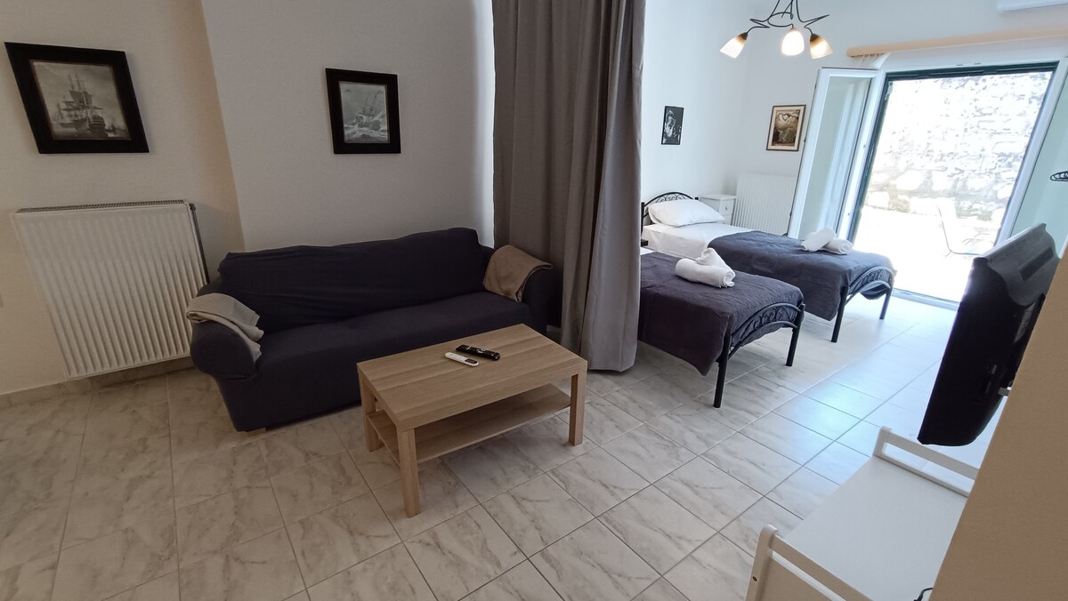 Íbúðin er á jarðhæð með stofu, fullu fæði í eldhúsi , baðherbergi og stóru svefnherbergi. Tilvalið fyrir par. Einnig eru stórar svalir. Fjarlægðin frá bænum Corfu er um 1,5 km,frá höfninni 3 km og 1 km frá flugvellinum og 200 m frá ströndinni. Íbúðin er nálægt öllum grískum krám og grískum kaffihúsum. Strætisvagnastöðin er í 1 mínútu göngufjarlægð . Bíla- og reiðhjólaleiga á góðu verði án aukakostnaðar. Netflix í sjónvarpi